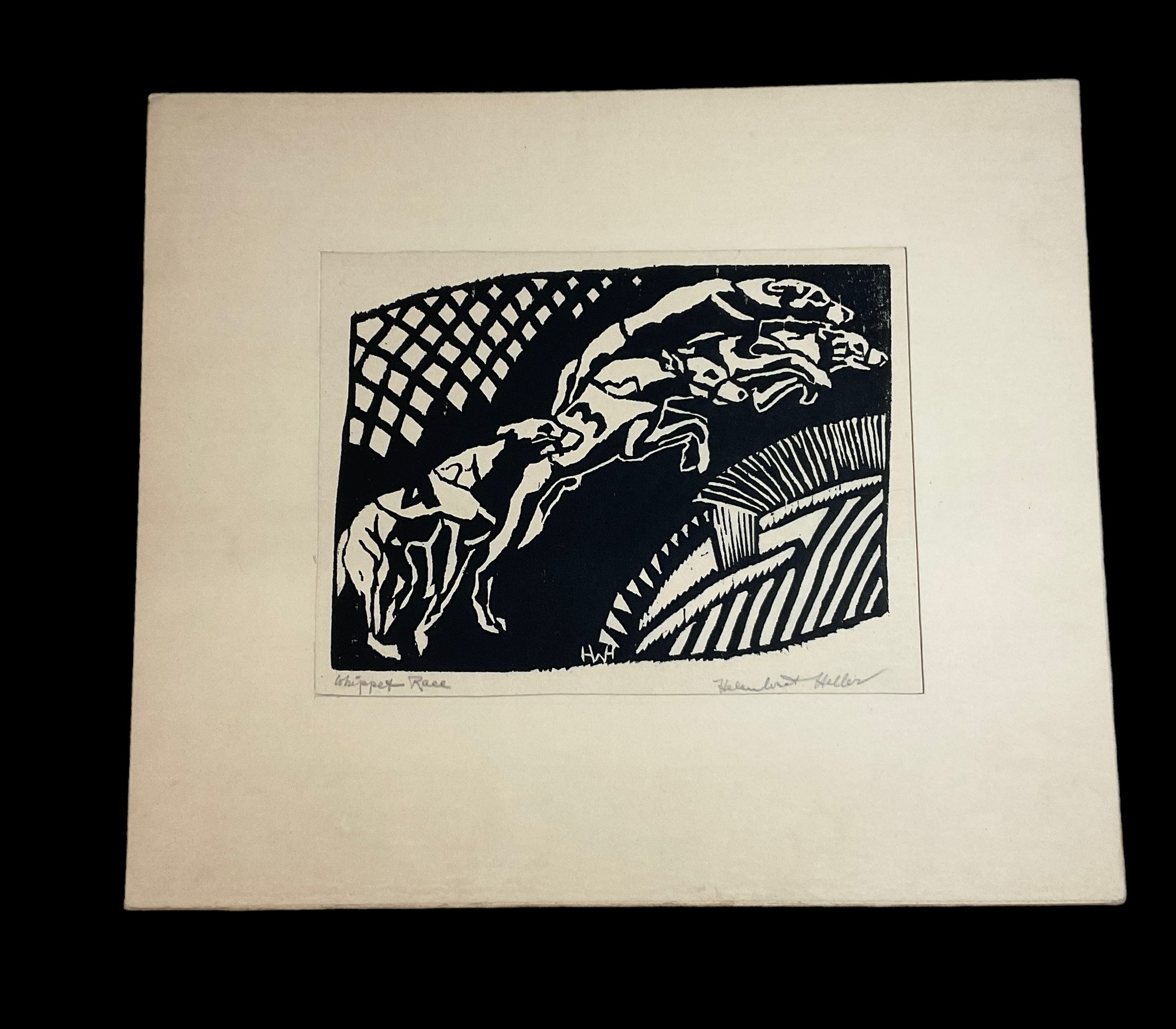 Whippet Race Helen West Heller Signed Woodblock, measures 6.5 x 8.5 inches.