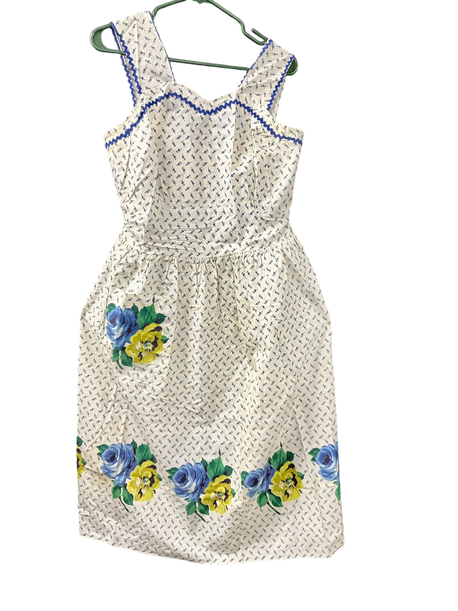 White Sweetheart Neckline 1950s Floral Dress, some discoloration, some loose threads on hem. From a smoke free and pet free environment.