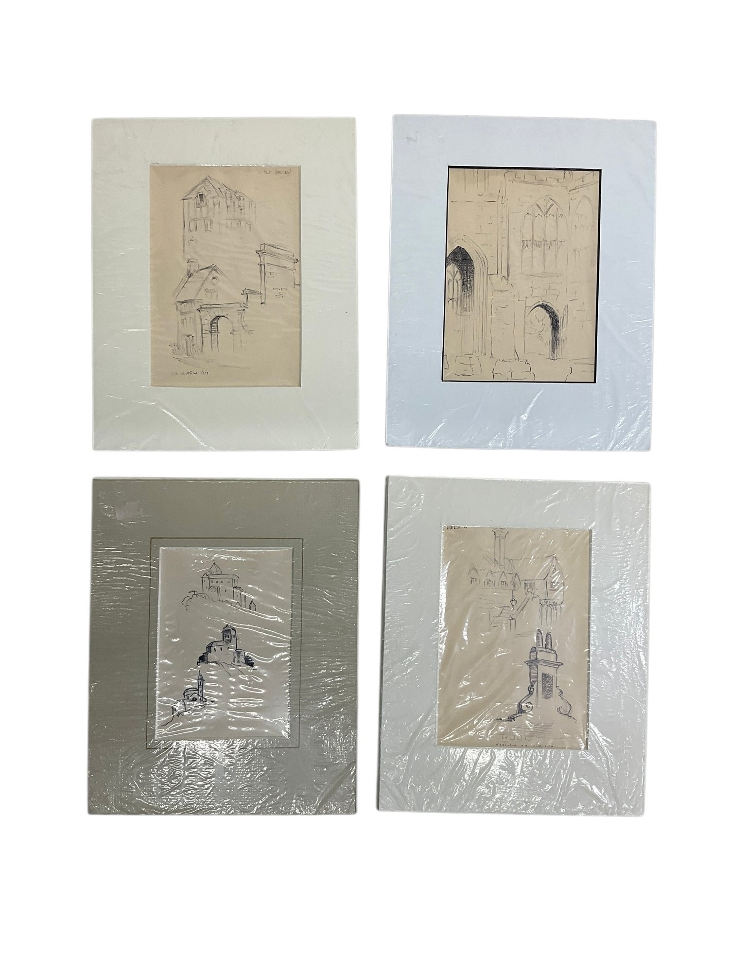William Dow (1891-1973) Four Ink Sketches Of England And European Scenes. All in good condition. Each sight size is approx. 6.5” by 4.5” and the mats are each approx. 10” by 8”.