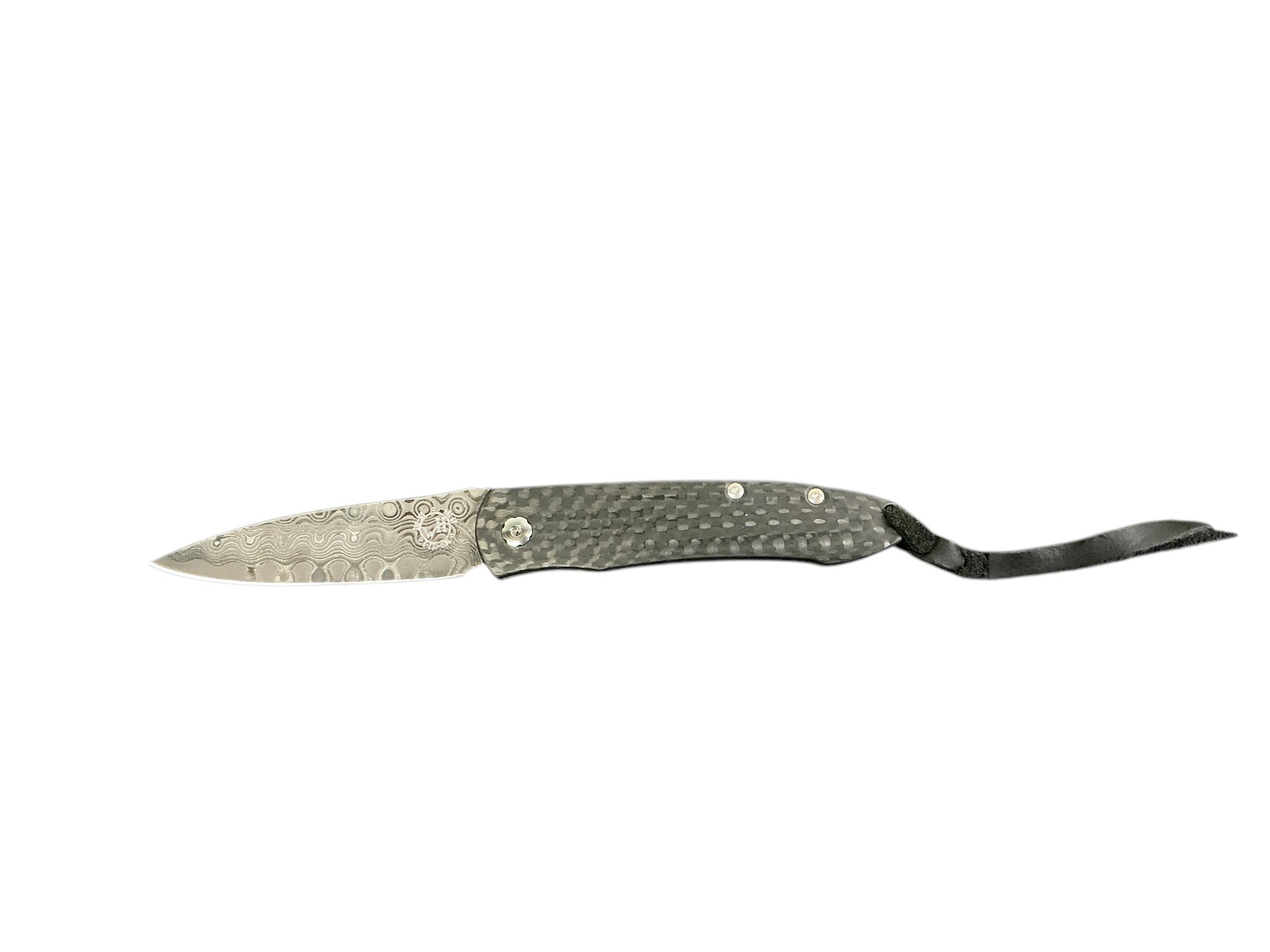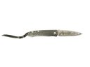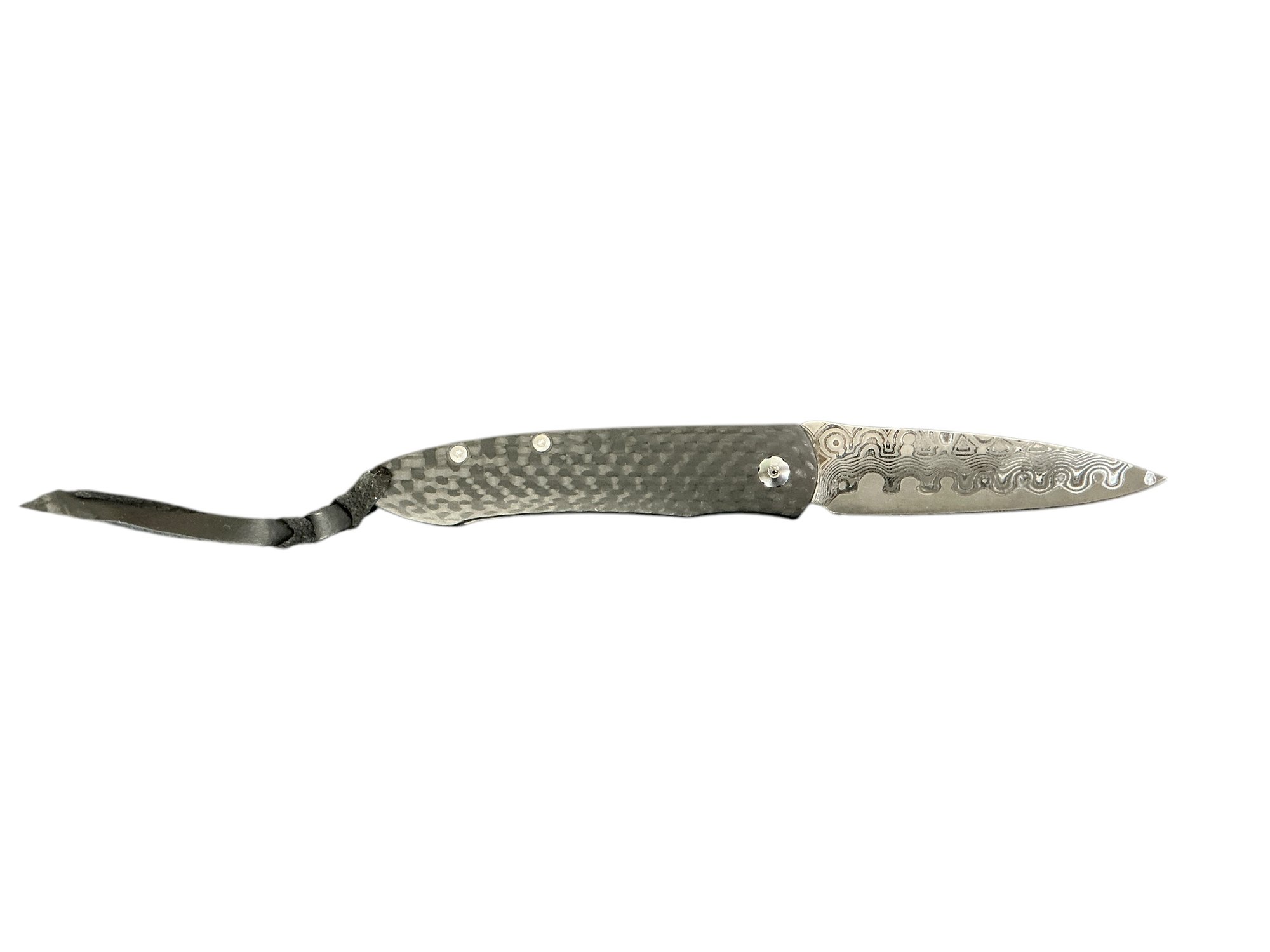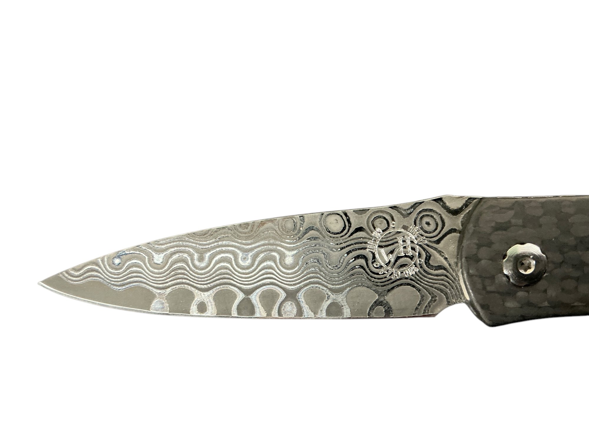 William Henry Legacy Model H230-D Friction Folder Pocket Knife Damascus Blade. The box has an oil stain but the knife itself is in excellent condition. Fully open it is approx. 5.5” long.