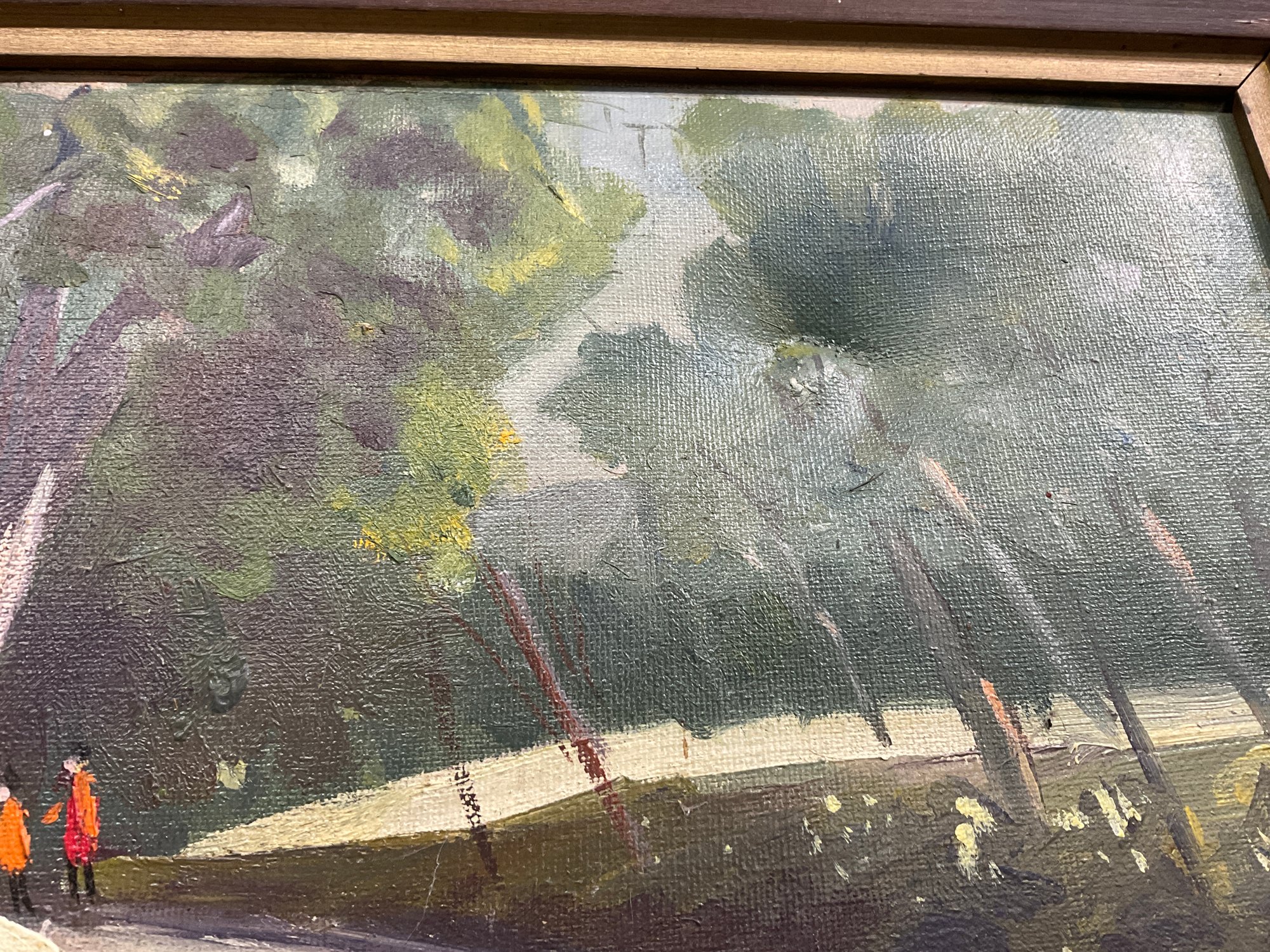 William Mitchell Gloucester MA Artist Vintage Oil On Canvas Of People Strolling Through Forest. In fair condition with one bump impression to the upper right corner. Sight size is approx. 11.5” by 15.5” and frame size is 16” by 20”.