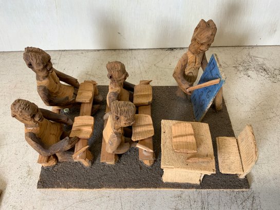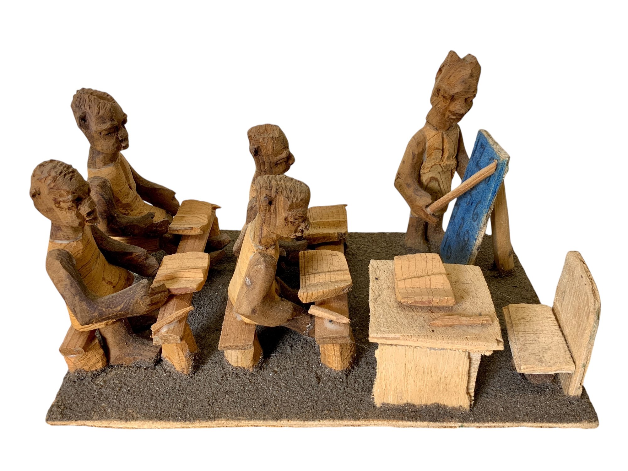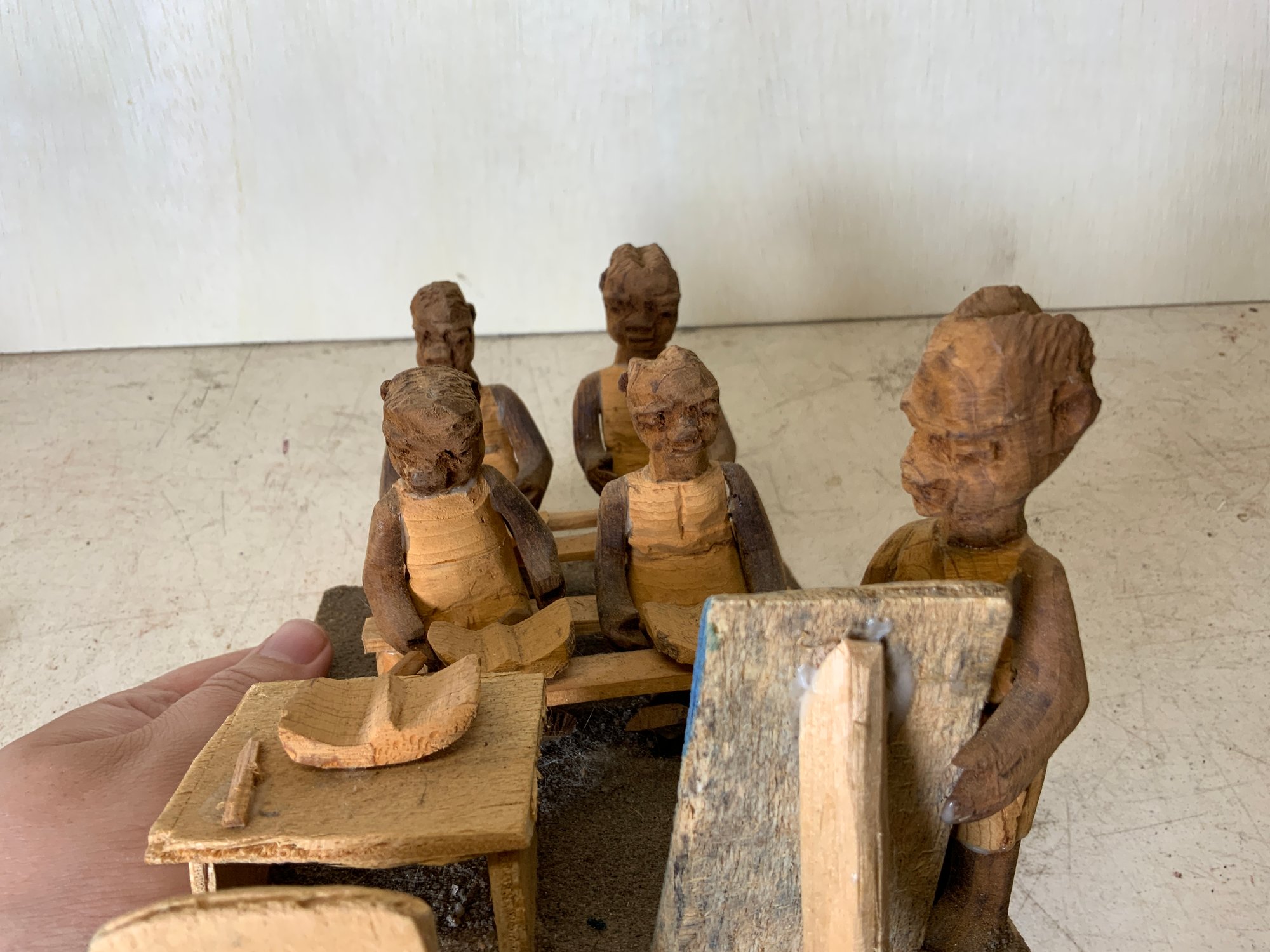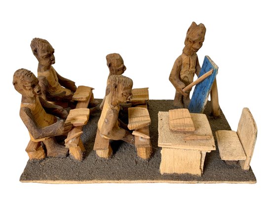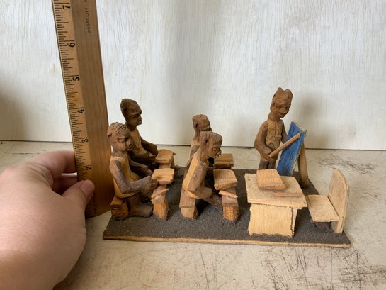 Wooden Folk Art African Carving School Room Scene, measures 8” x 5” x 4.”