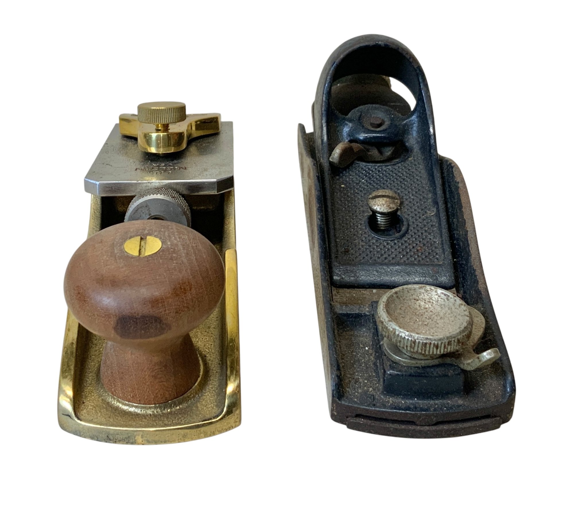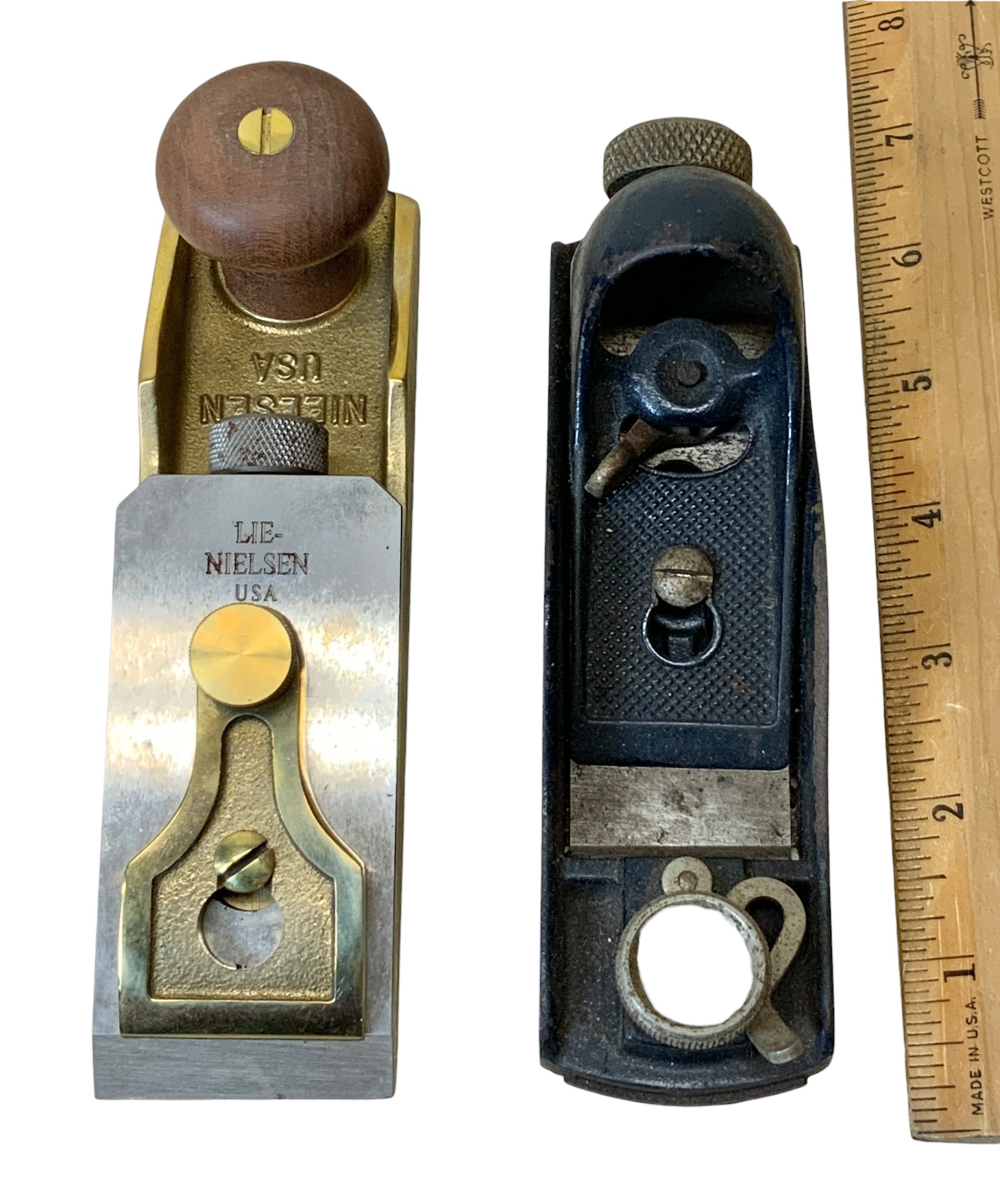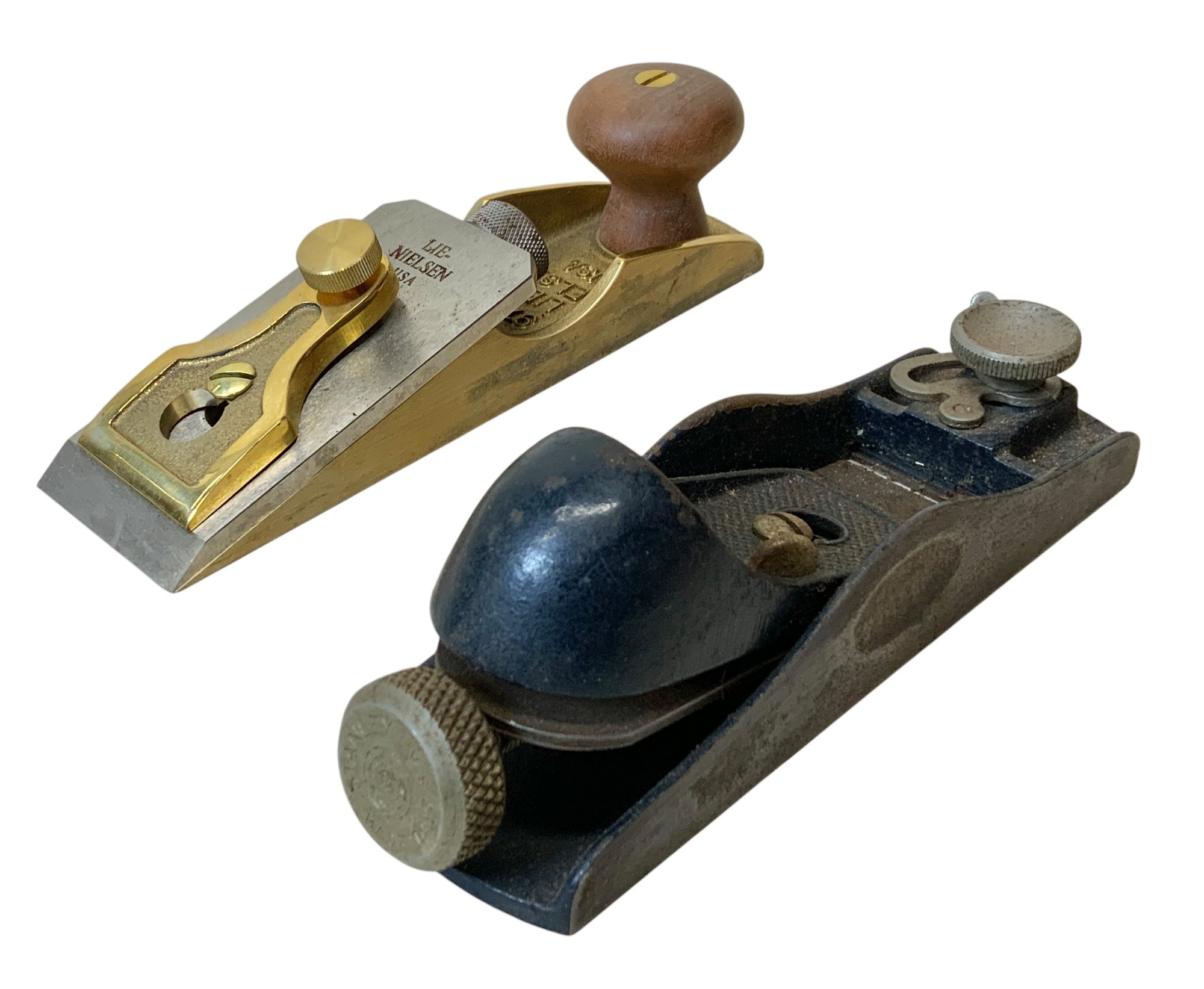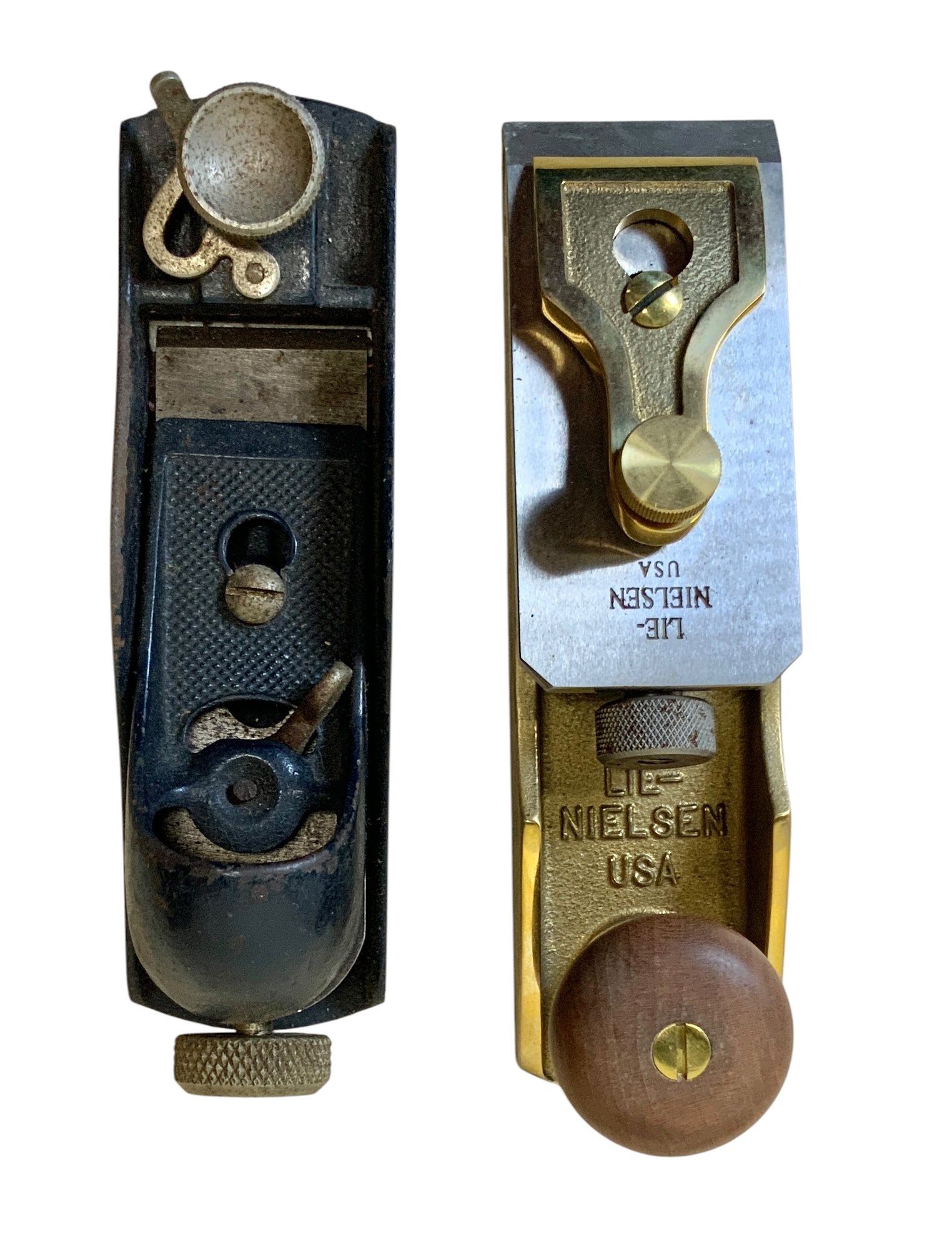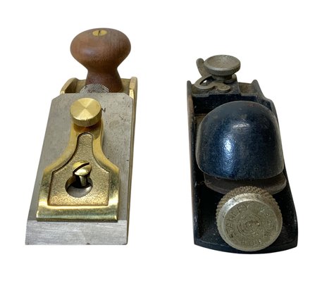 Woodworking Lot Of Lie-Nielsen #97 Chisel Plane And Vintage Block Plane. Small vintage Lie-Nielsen chisel plane is made of bronze, iron and wood, and functions like a paring chisel with depth control. Measures approximately 6.5” long.