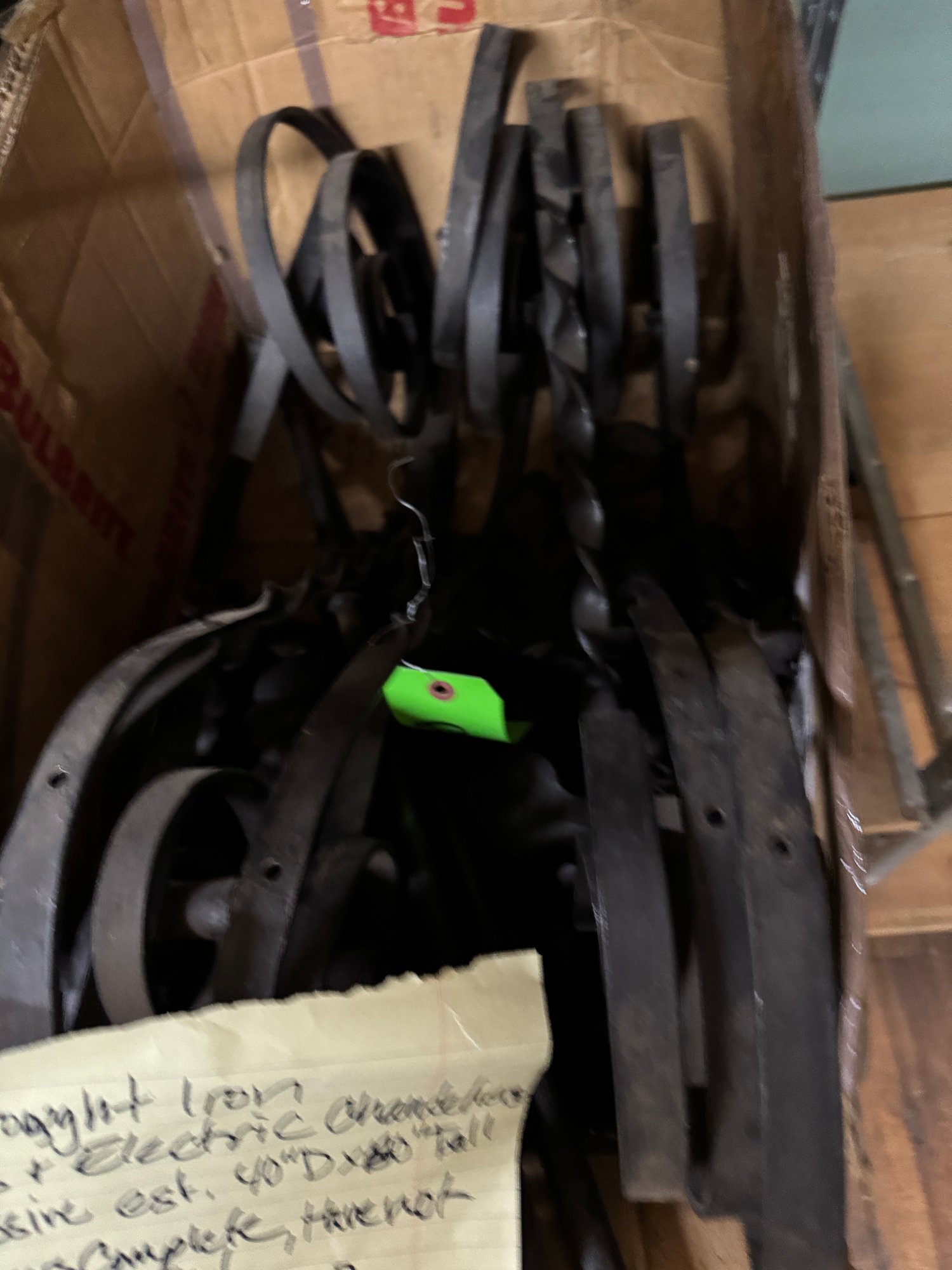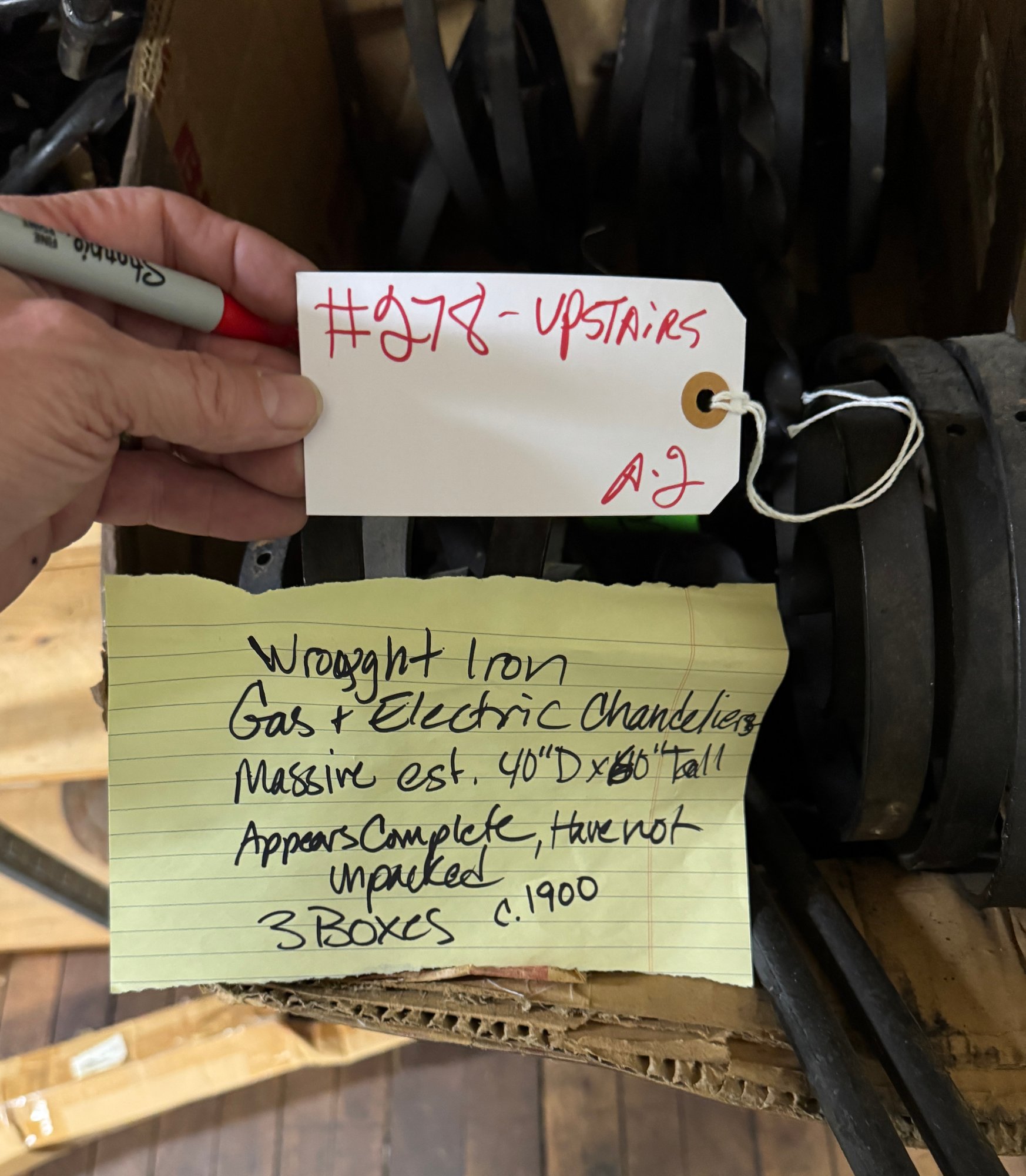Wrought Iron Gas & Electric Chandeliers measures 60" tall by 40" diameter. Client thinks it may be complete, but not unpacked. 3 boxes.