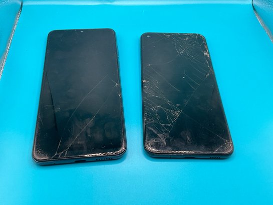 2 Used Cell Phones. Used, locked, broken screens. I plugged them in and they charged and turned on (I only charged enough to try them, not to test battery life). From a storage unit.