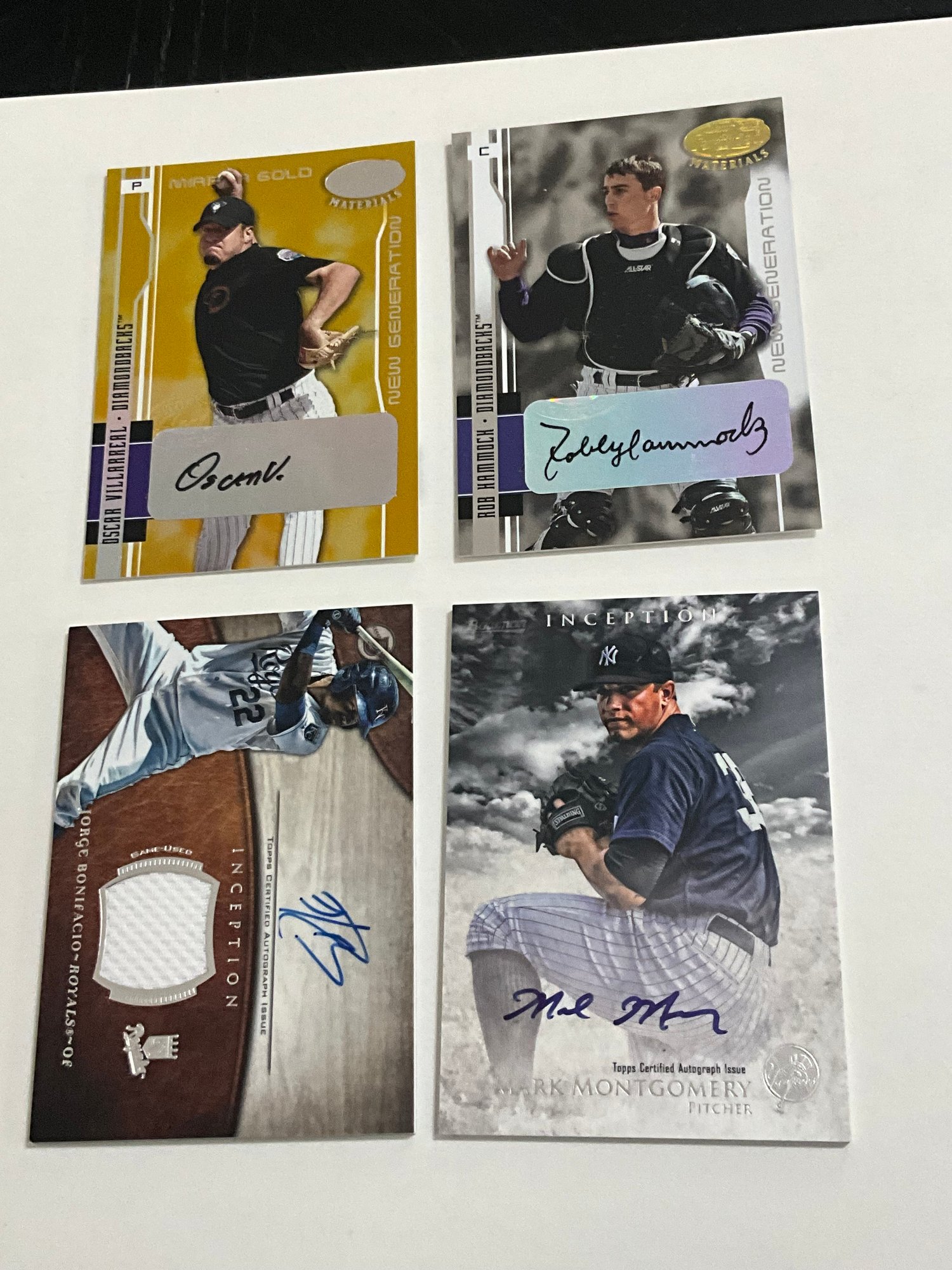 4 Autographed Baseball Cards Bonifacio (Jersey) Montgomery, Villarreal /25, & Hammock /400