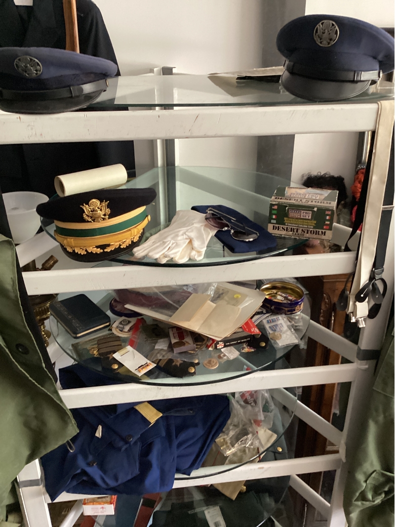 ASSORTED MILITARY CAPS, U.S. ARMY OFFICER , U.S. AIR FORCE, DRESS GLOVES, SHOULDER MARKS, MEDALS,