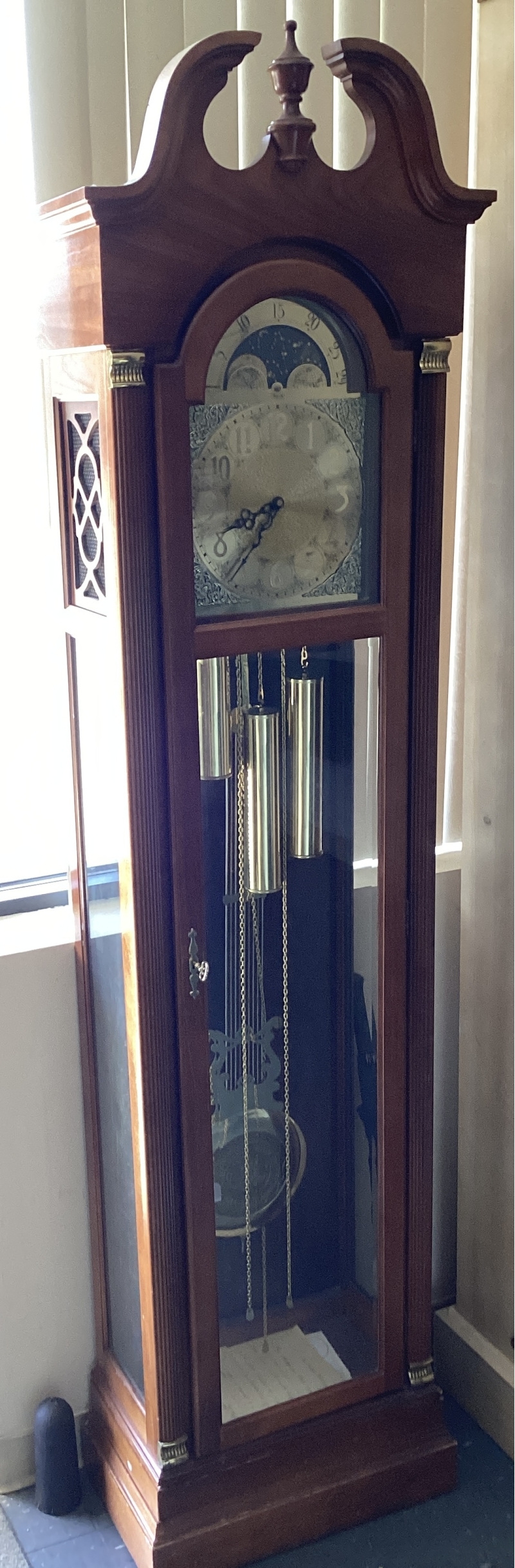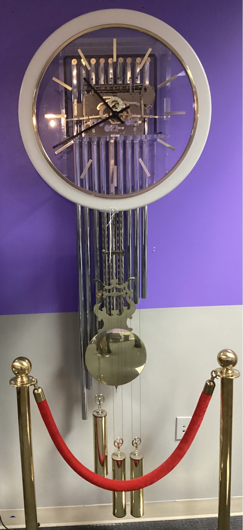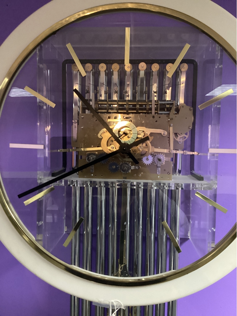 HOWARD MILLER LUCITE FOCAL POINT HANGING WALL CLOCK WITH WEIGHTS AND PENDULUM,