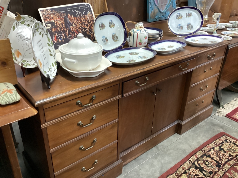 VINTAGE SOLID WOOD CHINOISERIE DRESSER, DECORATIVE BAVARIAN PLATES, COVERED TOUREEN SEECING DISH,