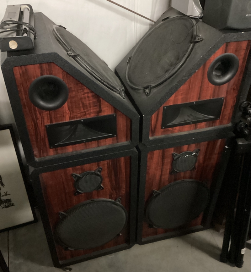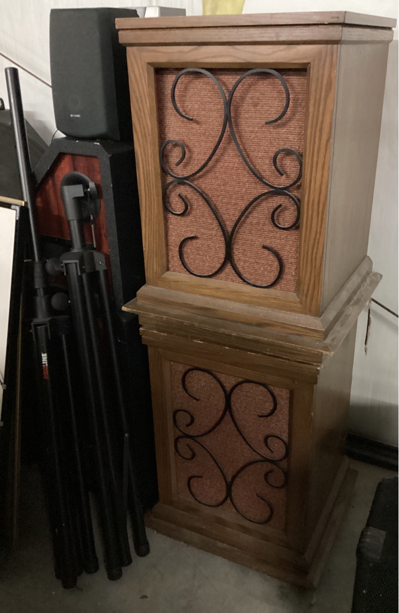 PAIR OF MID CENTURY HOUSE SPEAKERS, P.A. SPEAKER STANDS,