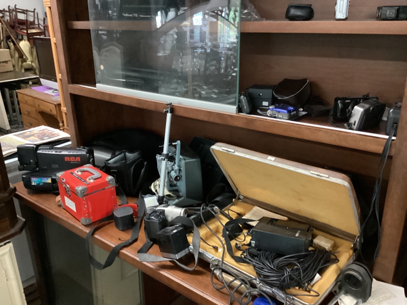 VINTAGE CAMERAS, PROJECTORS, VCR RECORDER & DESK,