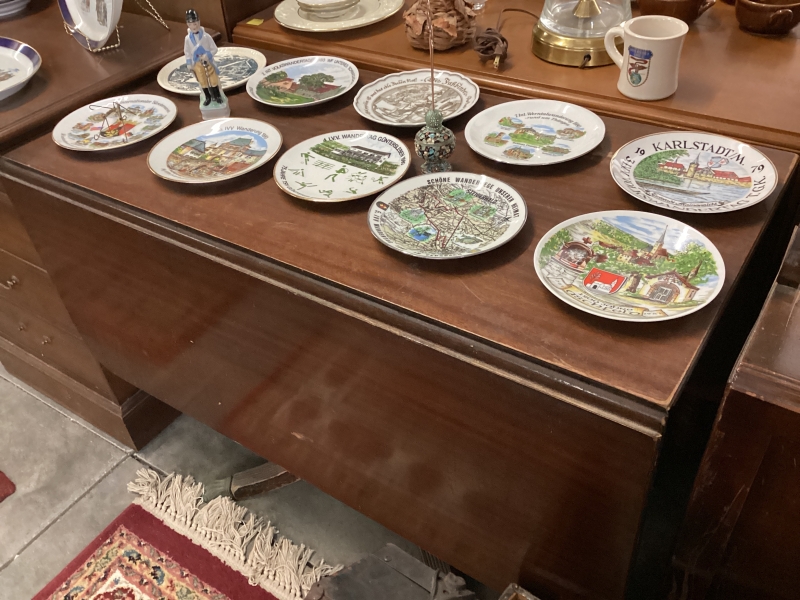 MID CENTURY DROP LEAF DINING TABLE, DUTCH & GERMAN SOUVINEER PLATE COLLECTION,