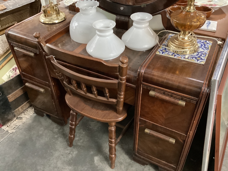 1930s WATERFALL VANITY DESK & CHAIR, GLASS LAMP SHADES,