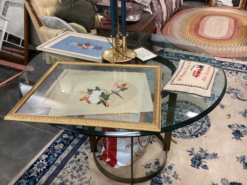 GLASS TOP COFFEE TABLE, NEEDLEPOINT ART,