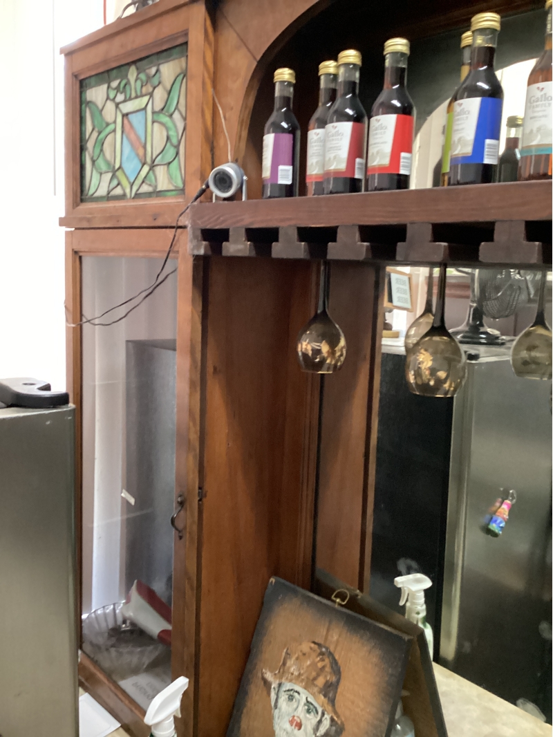 VINTAGE BREAK FRONT 4 DOOR CABINET, ANTIQUE BOTTLE COLLECTION, SODA BOTTLES, MEDICINE BOTTLES,