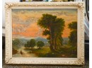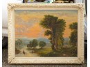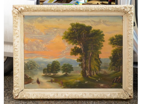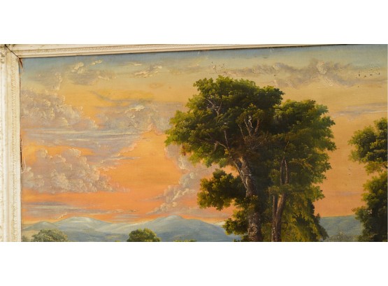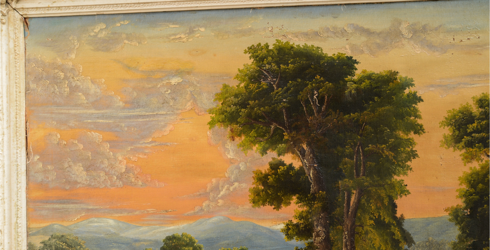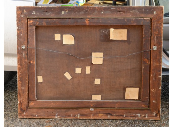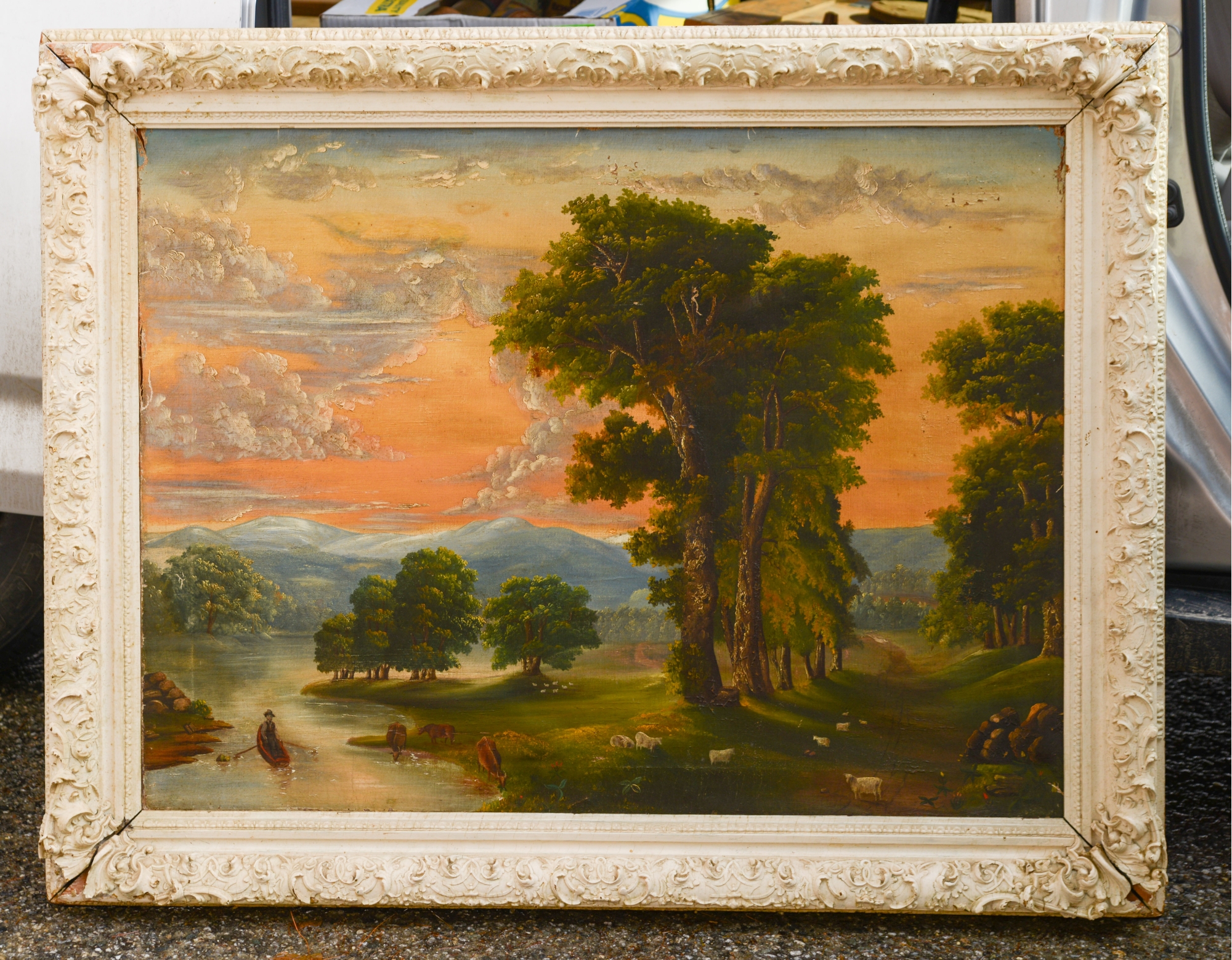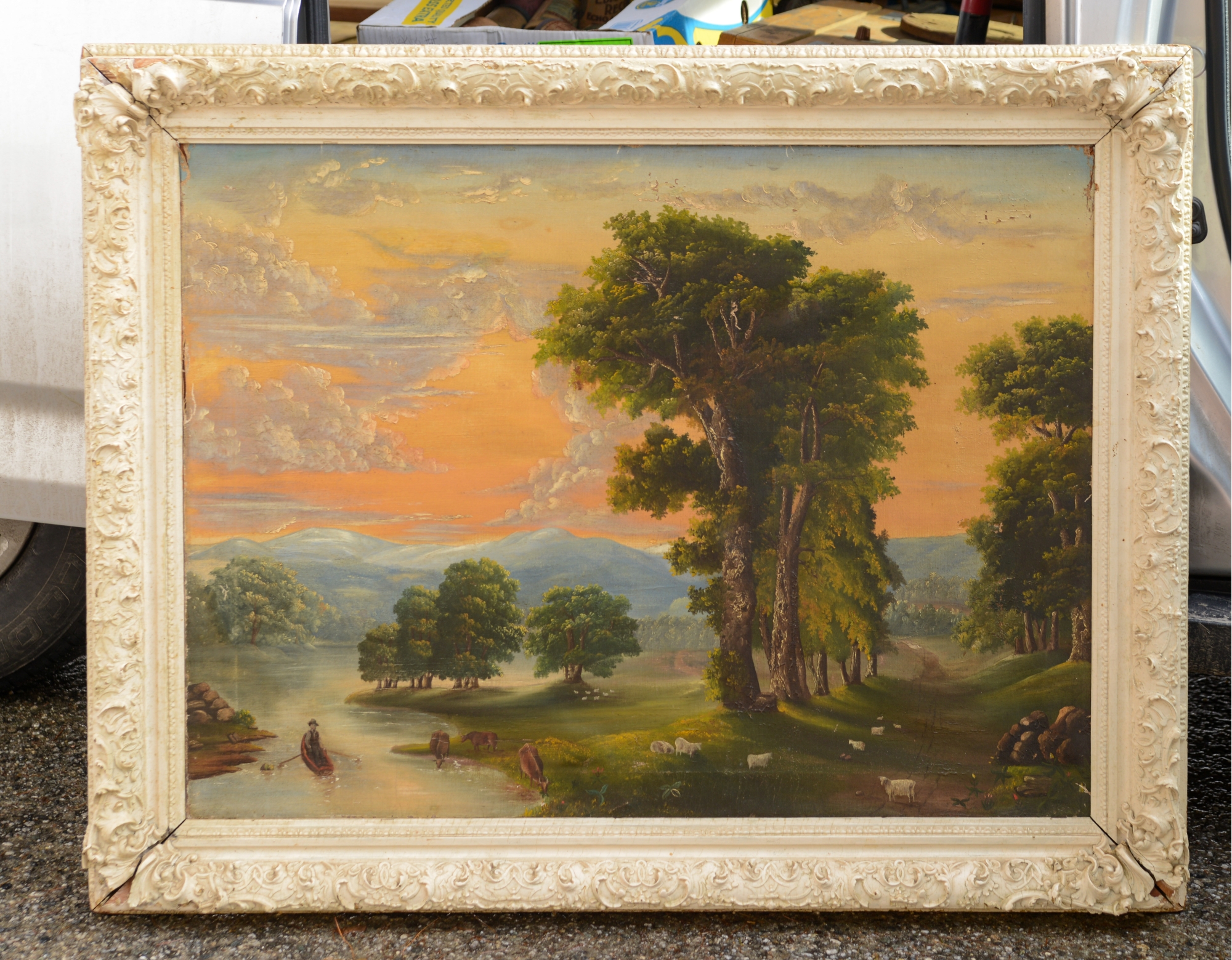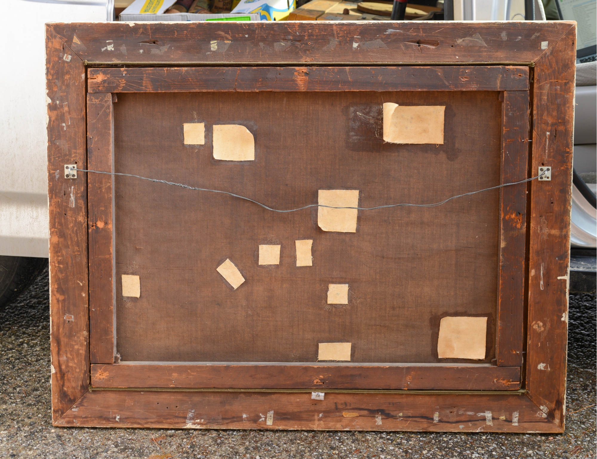 Oil on canvas, framed, 34 x 43 inches. Some tears and paint loss.