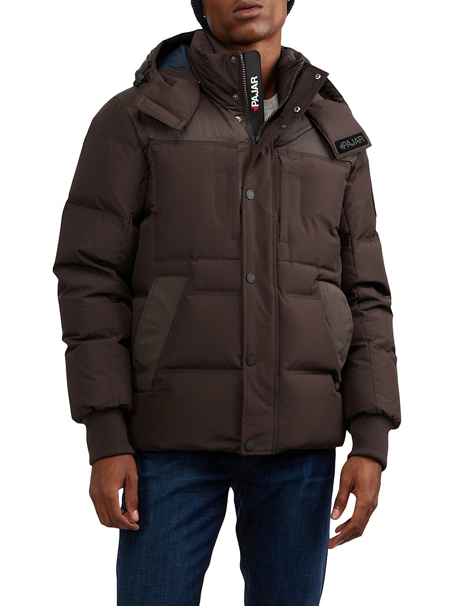 From the Heritage Collection. Warm and comfy down jacket with detachable hood and storm cuffs. Detachable hood Stand collar Long sleeves Storm cuffs Zip & snap-button front Two chest patch pockets Two waist welt pockets Lined Fabric 1: Polyester Fabric 2: Nylon Fill: Duck down Machine wash Imported SIZE & FIT Core fit About 29" from shoulder to hem. Men's - M Outerwear > Saks Off 5th. Pajar. Color: Dark Oak. Size: XXL.