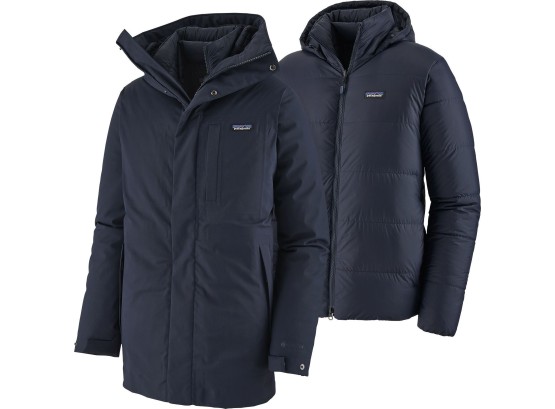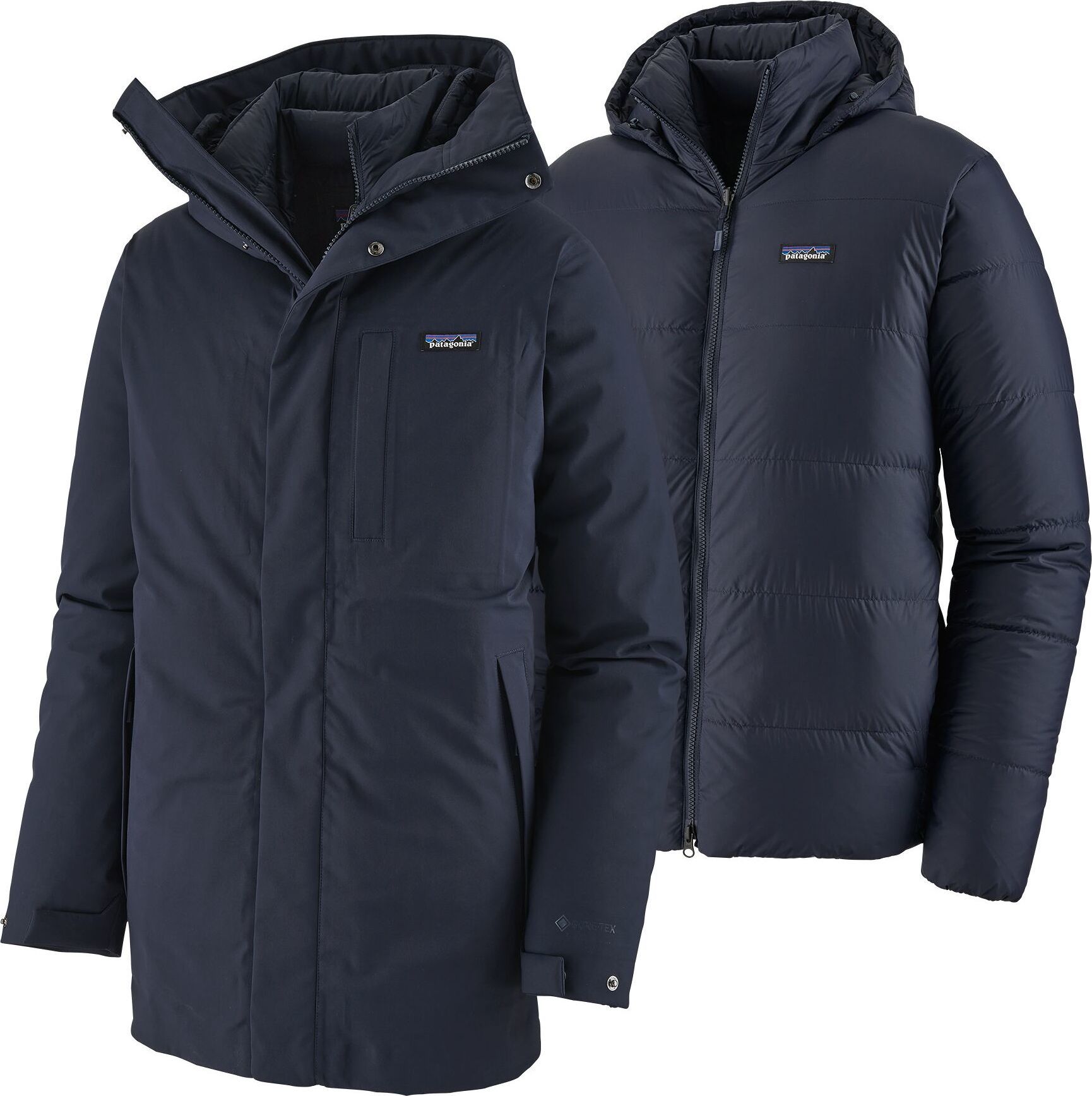 Ethical Down Parka. The men's FROZEN RANGE Parka by Patagonia is a 3-in-1 jacket for protection from winter's worst, with an ethical construction leading the way to a better future. 700 fill power down is all recycled from down products-and warm. The waterproof stretch shell is 92% recycled 3L GORE-TEX with a flannel backer. The shell and lining zip out, so you can enjoy cool weather in the comfort of the all-recycled poly ripstop lighter inner, complete with a Durable Water Repellent finish. The snorkel style hood offers element protection, and the storm flap makes sure nothing gets close to the 2-way front zip. Zip handwarmer pockets keep hands comfy and essentials secure. The fabric is bluesign-approved, and the jacket is Fair Trade Certified-sewn.