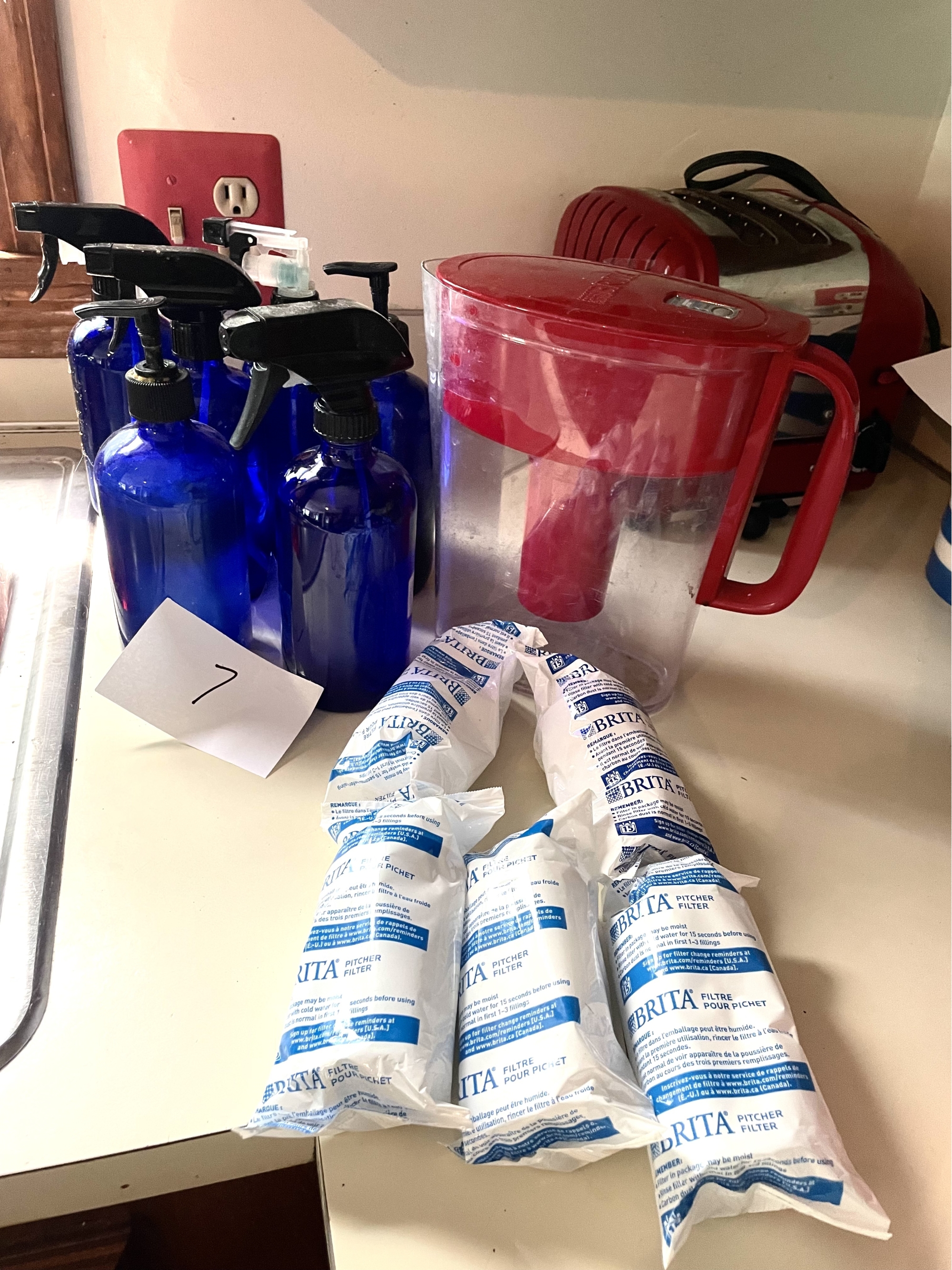With 6 cobalt glass kitchen bottles. Height of bottles 9 inches.