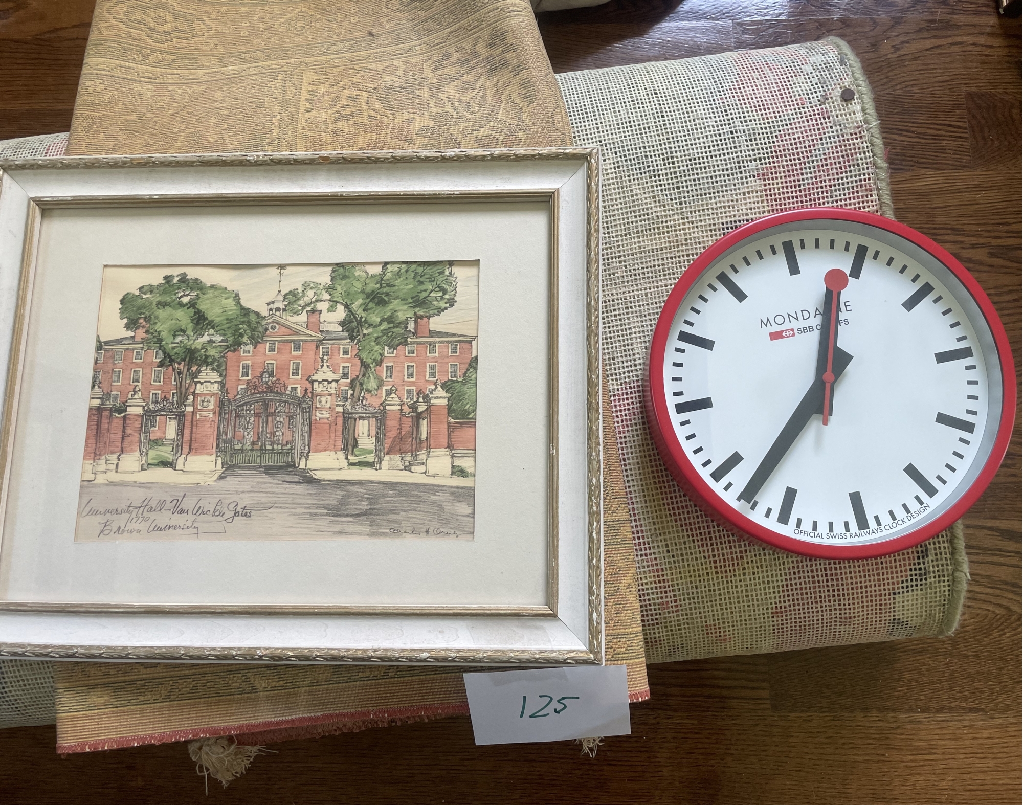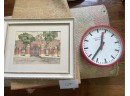 Framed. Print 8 inches x 11.5 inches, frame 14.5 inches x 18.5 inches. With wall clock.