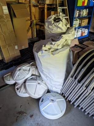 Size unknown, appears to be smaller, probably 10 x 20 or 15 feet square. Includes weights.