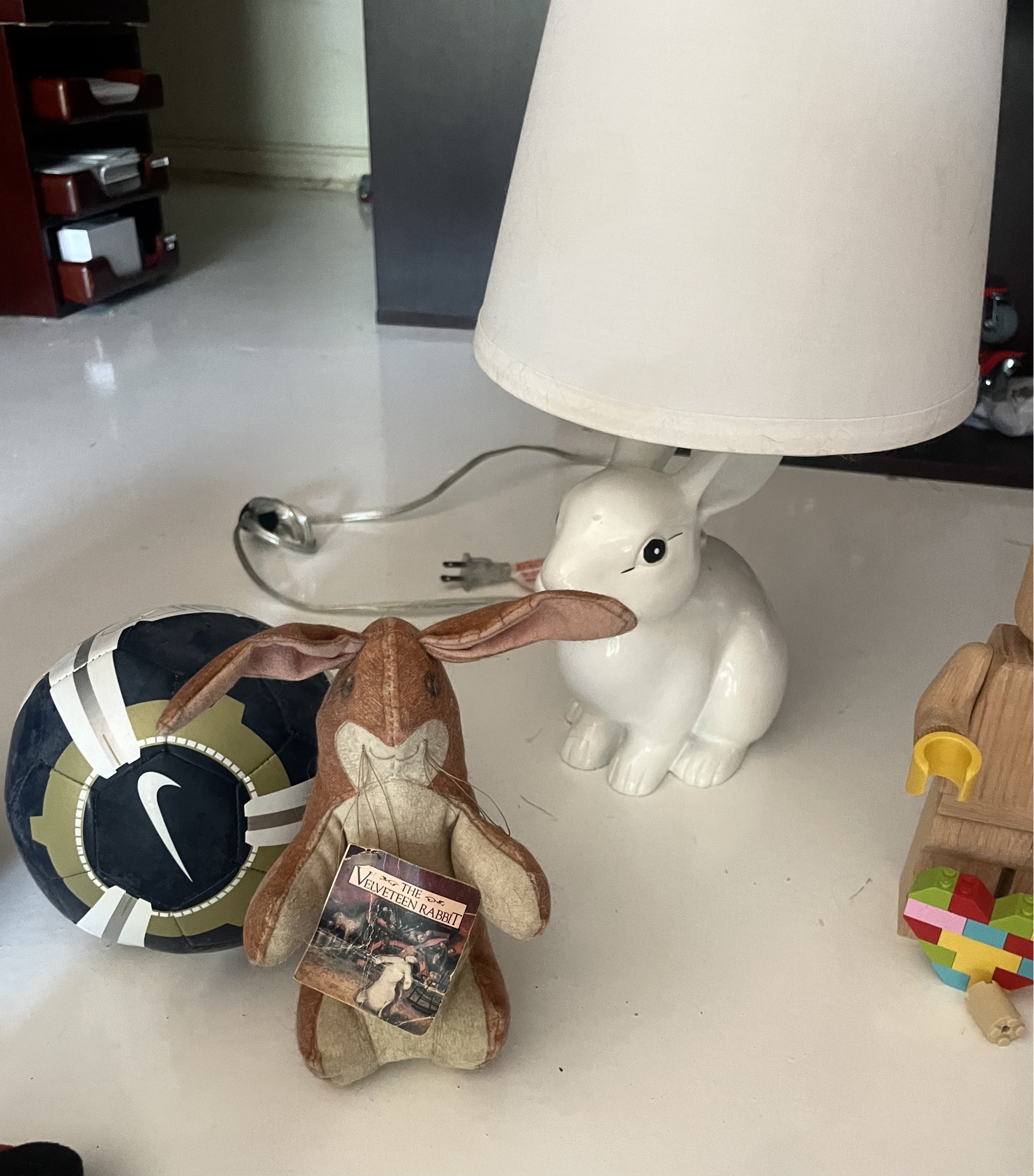 With other animals, wood lego robot and 2 small soccer balls. Height of lamp 17 inches.