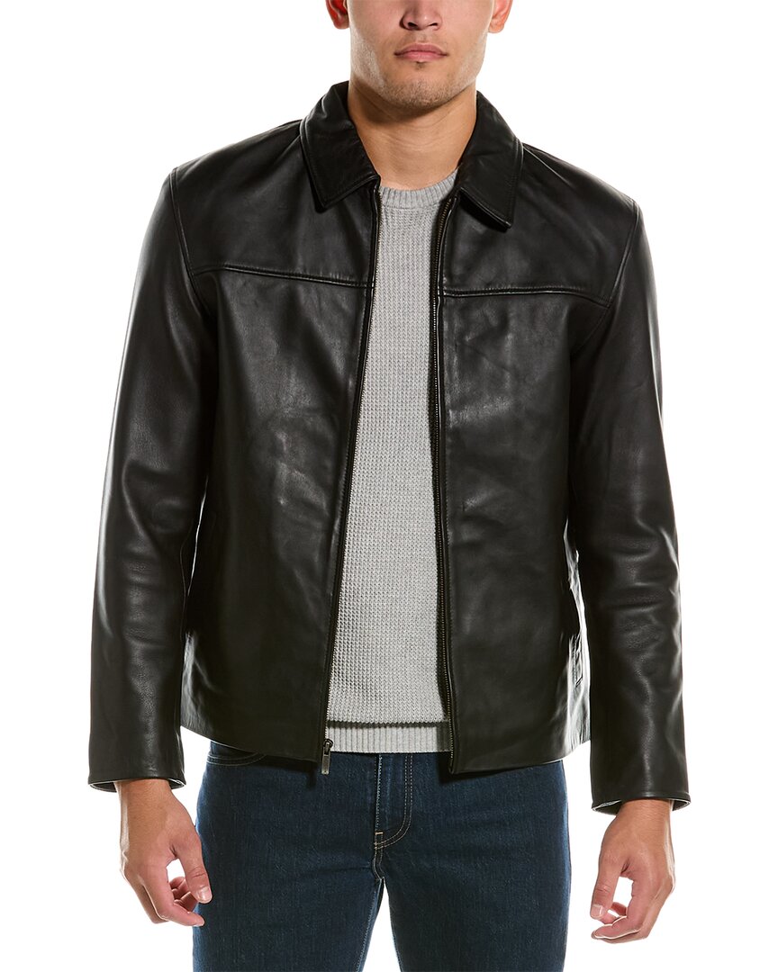A smooth leather shell and quilted lining add a modern style to this Cole Haan jacket. Point collar Long sleeves Zip-front closure Front welt pockets Lined Lamb leather Dry clean by leather specialist Imported SIZE & FIT About 27" from shoulder to hem Model measurements: 6'2 tall Model is wearing a US size Medium. Men's - M Outerwear > Saks Off 5th. Cole Haan. Color: Black. Size: XXL.