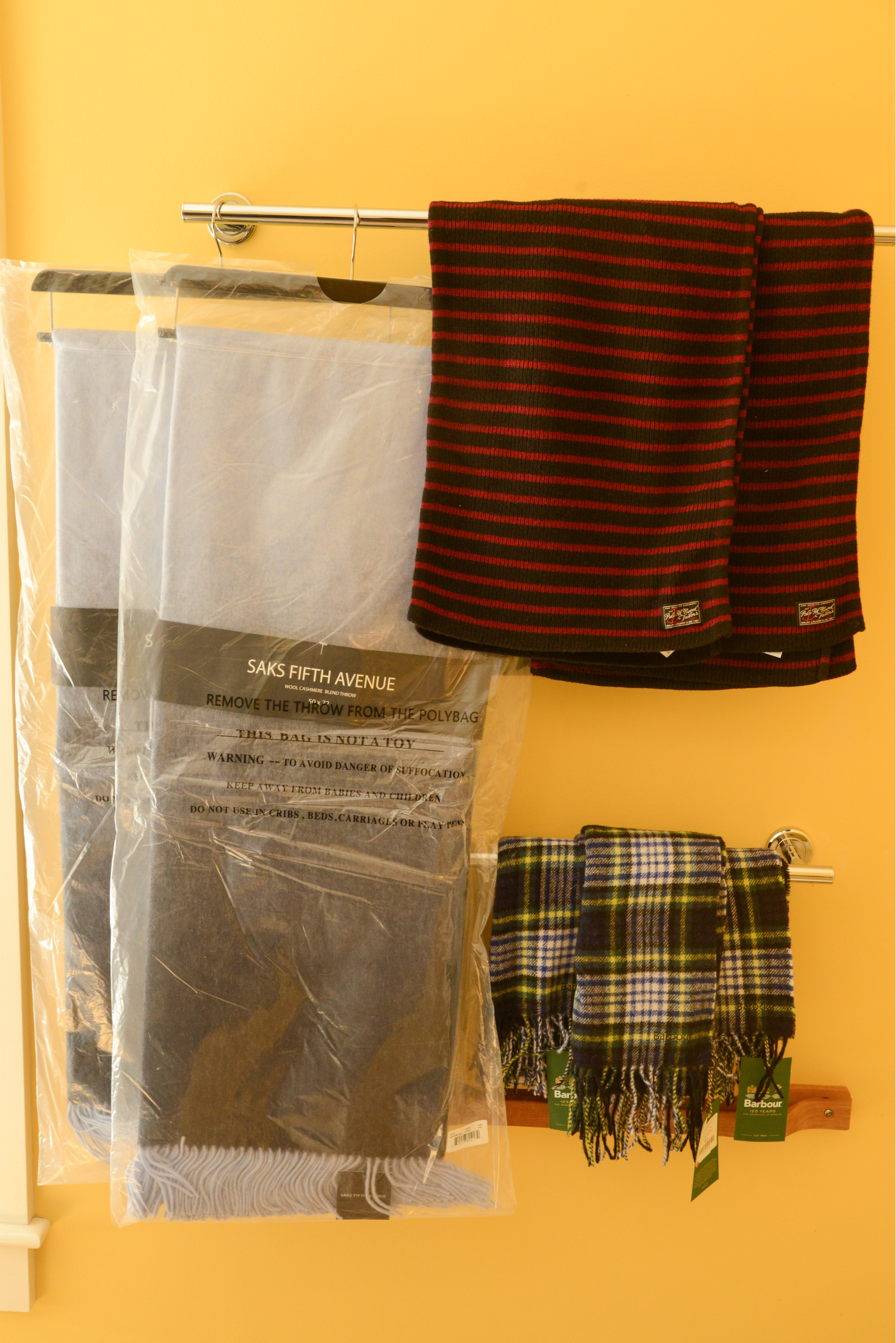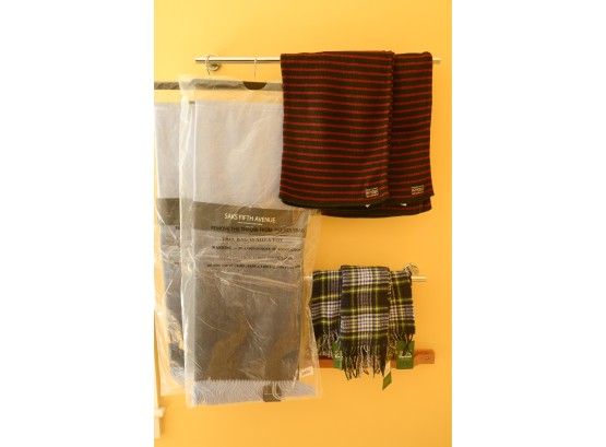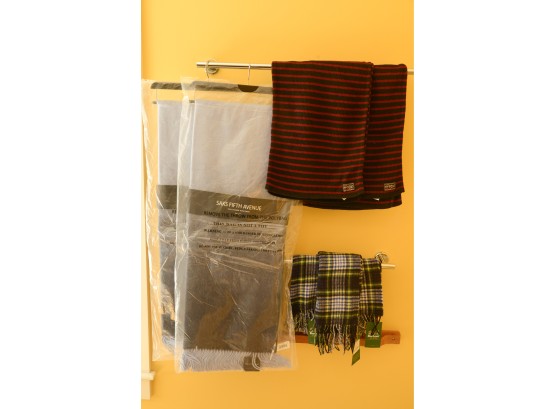 2 Saks Fifth Avenue throw wool/cashmere blend 50x72 inches, 2 Polo Scarves, 3 Barbour scarves.
