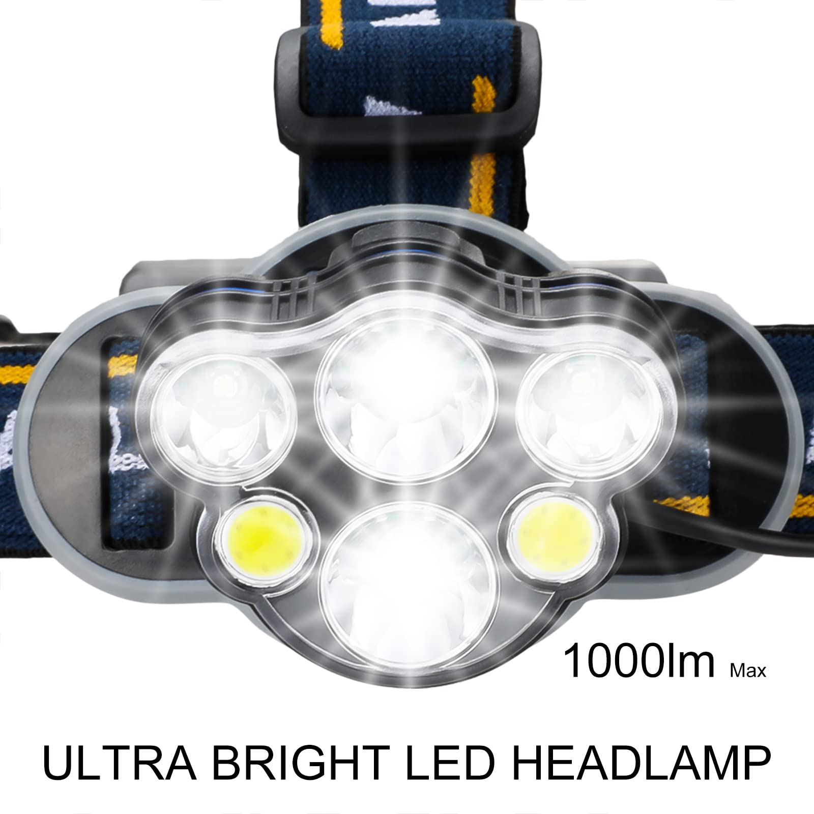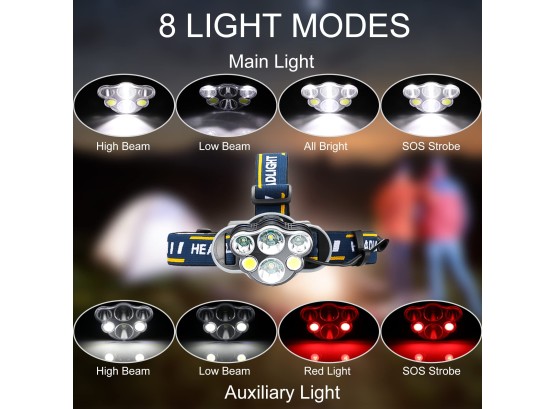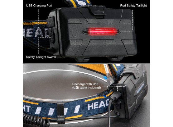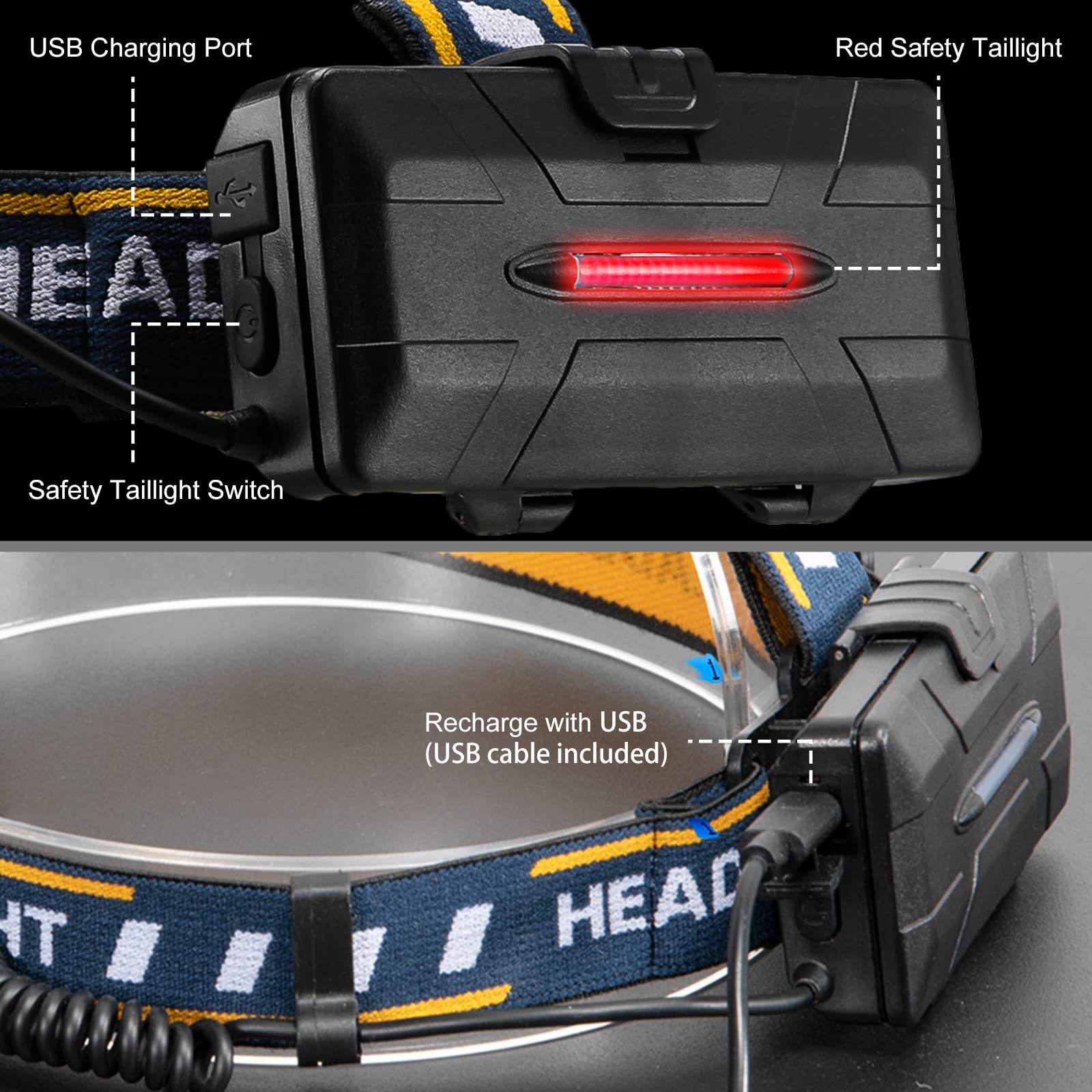 【Super Bright & 8 Lighting Modes】 Headlamp flashlight equipped with 6 LEDs and a safety red taillight. The LED headlight has 8 lighting modes to meet your various needs. ①One simple switch to control two different modes. Press the switch to control the primary light mode from high, low, all, and SOS strobe. ②Press the switch for 2-3s to control the auxiliary light mode from high, low, red light, and SOS strobe. 【USB Rechargeable Headlamp】 With an integrated USB charging port, the headlight is as convenient as it gets. Built-in rechargeable high-capacity battery, you can plug it into your car, the garage, or the kitchen—it's ready to go when you are. 【Long-Lasting & Durable】 The headlamp if fully charged will provide up to 4-9 hours of constant light on a single charge (USB cable included). Even if you really got into an all-night epic, the headlight can keep you lit through the long dark hours. 【IPX-4 Water Resistant & 90-degree Adjustable】 The head lamp have passed the IPX4 waterproof certification. the IPX4 water-resistant grade allows you to use the rechargeable headlamp even when it’s raining. The head flashlight uses a comfortable elastic headband that can be adjusted to perfectly fit the forehead size of adults and children with a simple adjustment. 【Light Head Lamps & Hands-Free】 The headlamp with a hand-free design and lightweight of about 0. 3 pounds keeps your hands free while outdoor camping, jogging, cycling, night racing, fishing, hunting, hiking, reading, car repair, and various night activities.