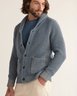 garter stitch at shawl collar, placket, top of cuff, top of pocket opening Rib cuffs and hem patch pockets and faux horn button closure.
