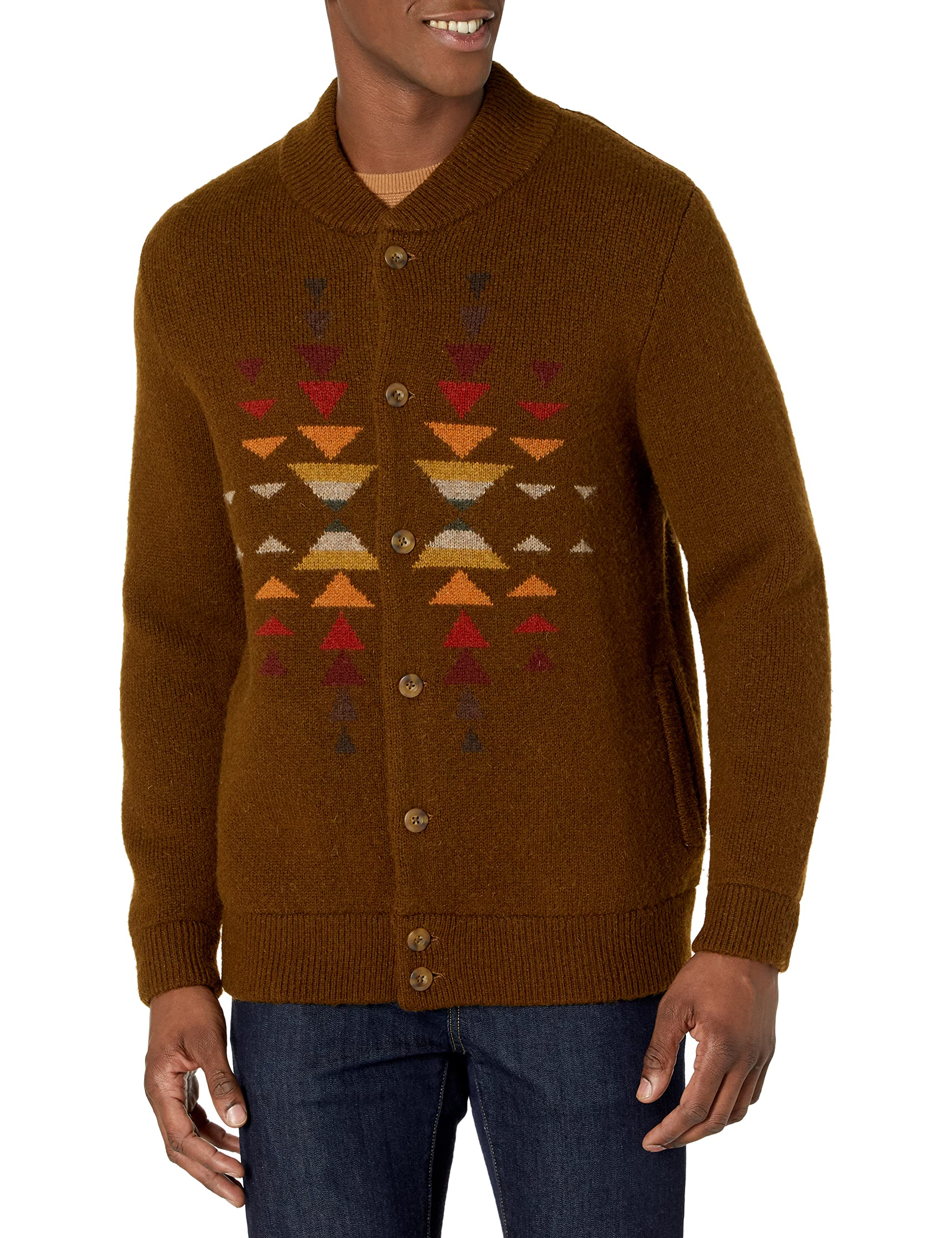 Button closure Side seam pockets Ribbed neck, cuff and hem