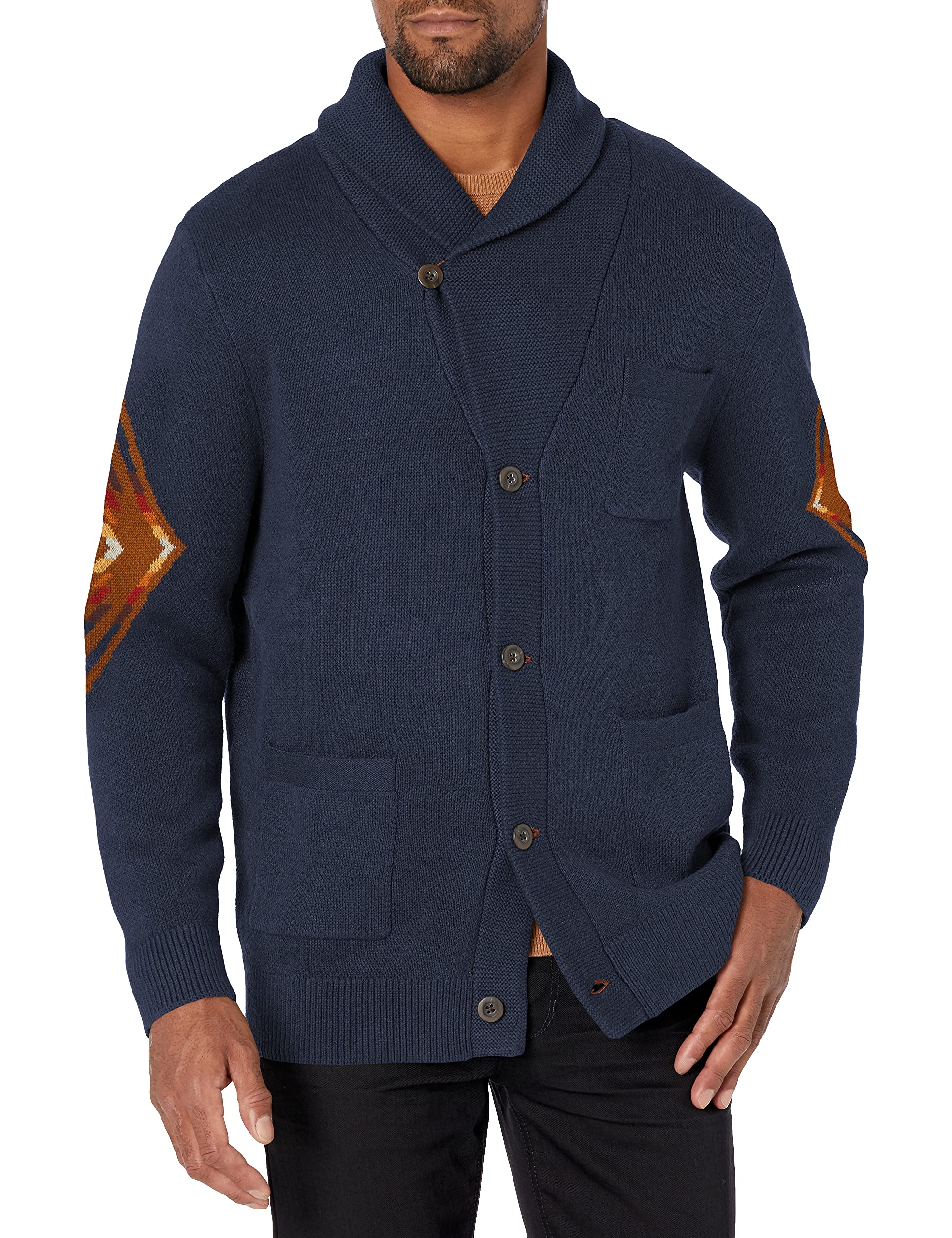 Button closure Patch chest pockets Ribbed shawl collar,cuff and hem