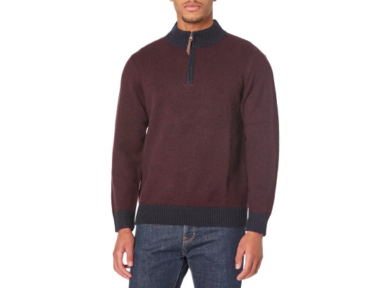 Washable wool for this sweater is sourced from New Zealand, known for humane and sustainable sheep ranching. Mock neck half-zip styling leather zipper pull