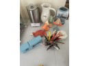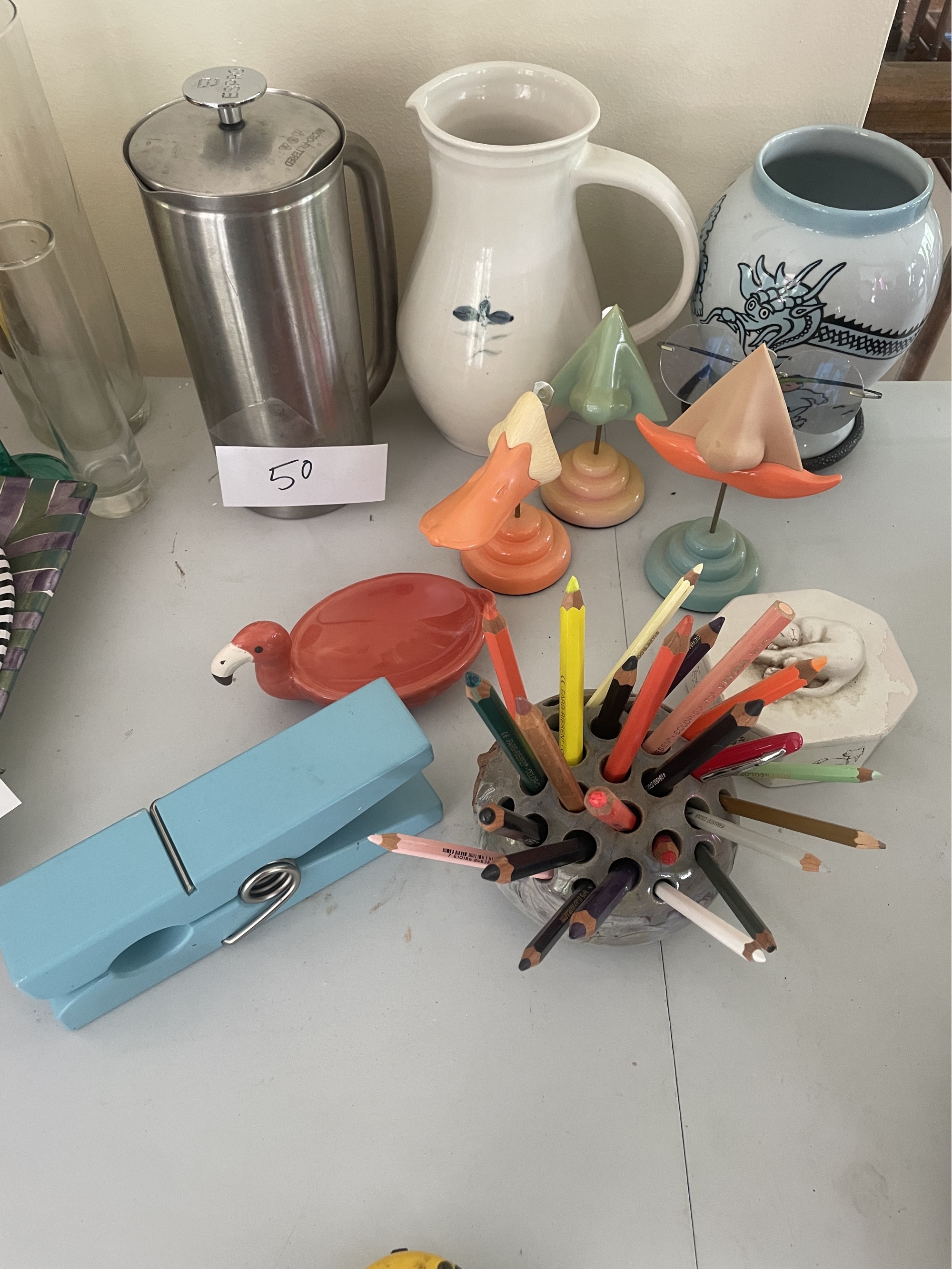 Including pitcher, cat box, 3 cartoon eyeglass holders etc. Height of espresso maker 10 inches.