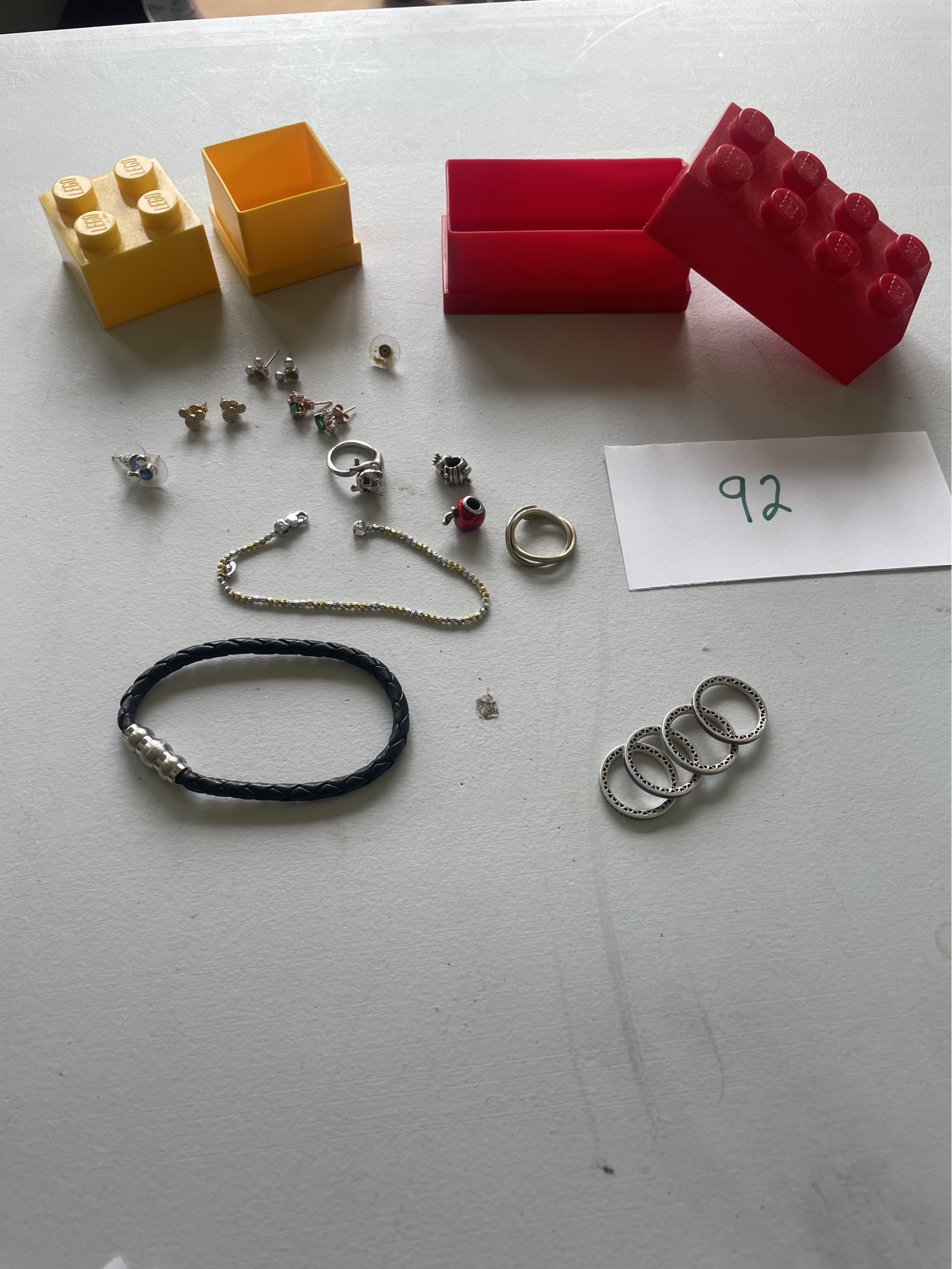 With 4 silver and stone rings, 2 bracelets, charm bracelet and 2 lego boxes.
