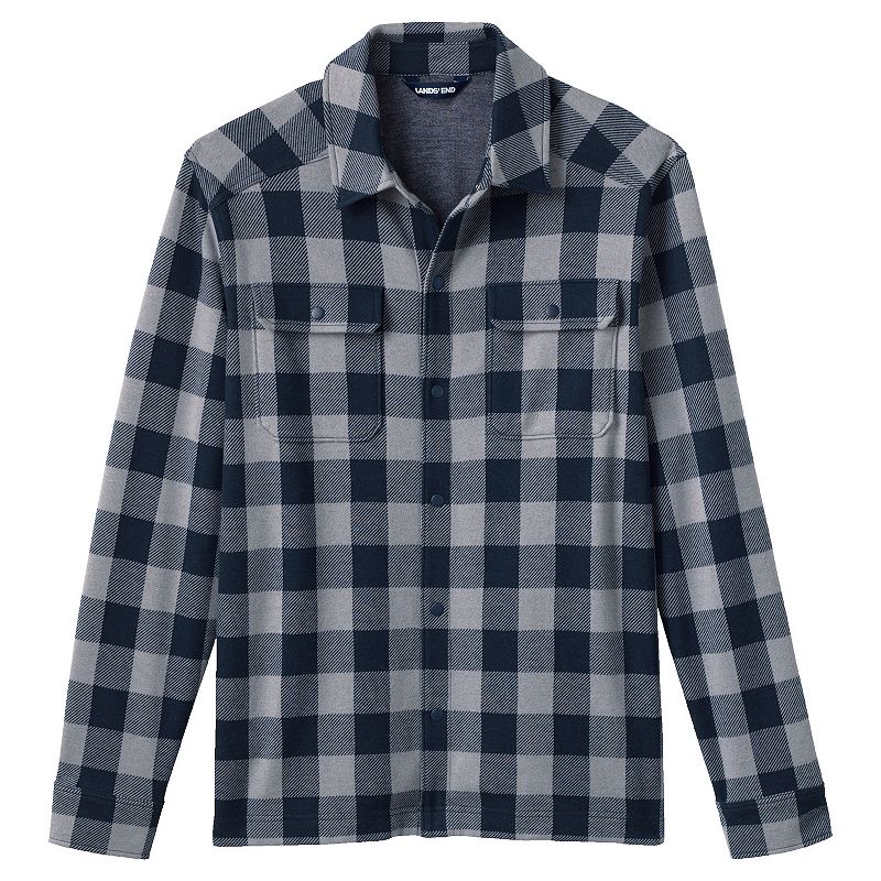 Layer up for cool temperatures with this brushed jacquard shirt jacket from Lands' End. Layer up for cool temperatures with this brushed jacquard shirt jacket from Lands' End. Plaid pattern 1 button flap pocket Stretch fabric allows comfortable movement Long sleeves Snap frontFIT & SIZING Classic fitFABRIC & CARE Cotton, polyester, spandex Machine wash Imported Size: XXL. Color: Blue. Gender: male. Age Group: adult. Pattern: Buffalo Plaid. Material: Cotton Blend.