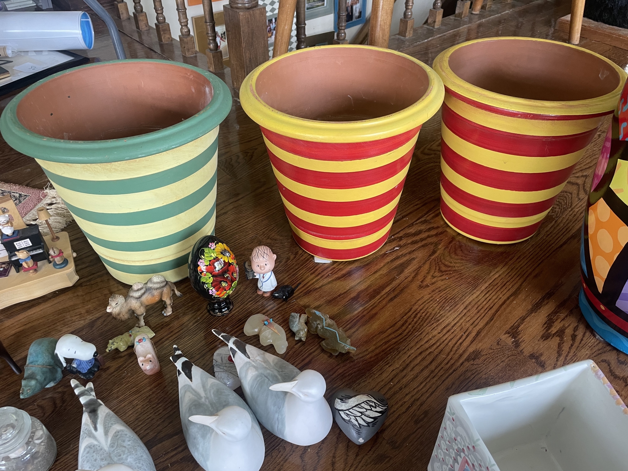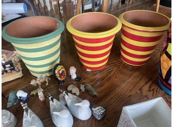 Including 3 striped painted terra cotta planters and collection of birds and animals. Height of vase 25 inches. Good condition.