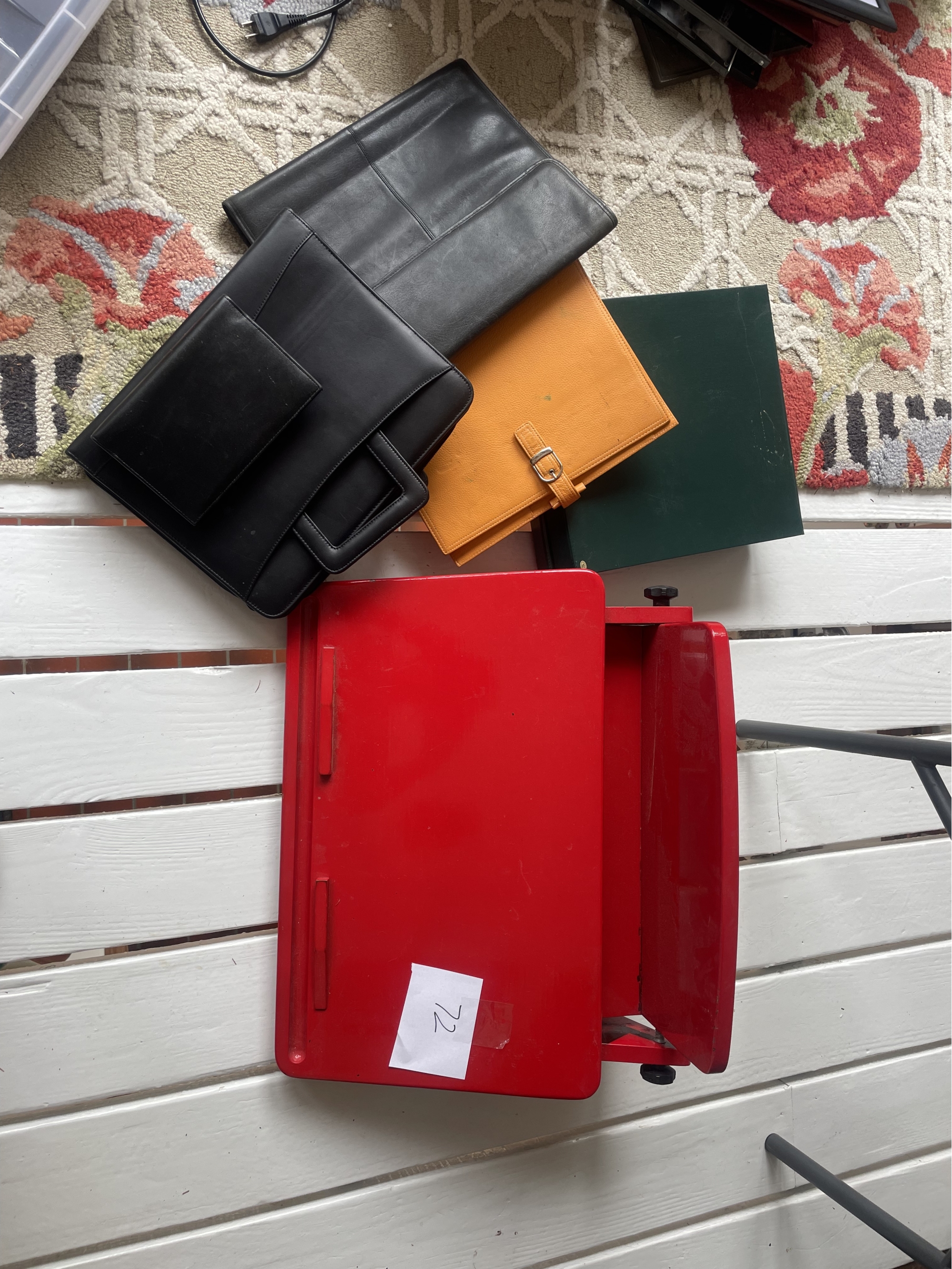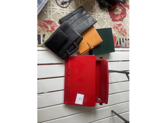 With 3 leather cases and a photo album. Width of desk 23 inches.