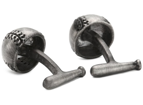 Antiqued cufflinks featuring half-baseball face and fixed bat backing Domestic N