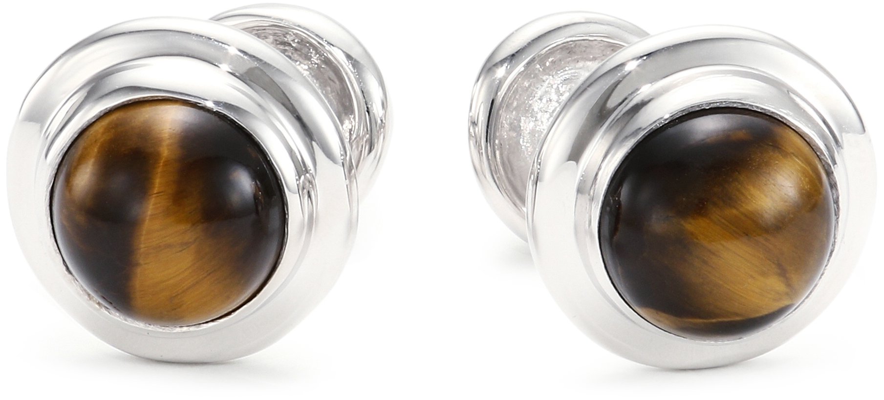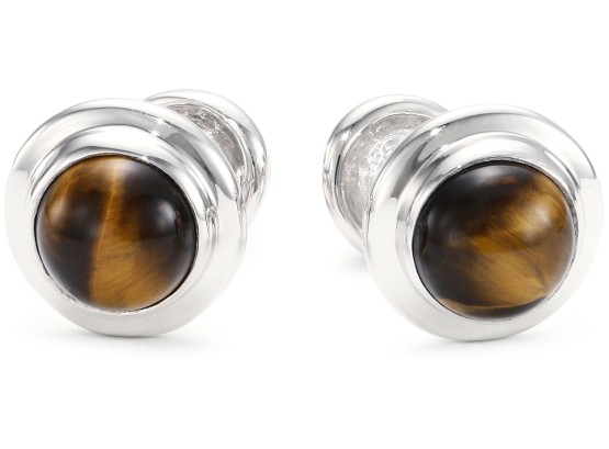Cufflinks in rhodium-plated sterling silver featuring round tiger eye stones in bezel settings Due to the natural elements of tiger eye, the stone may vary in color, size or shape. Made in United States