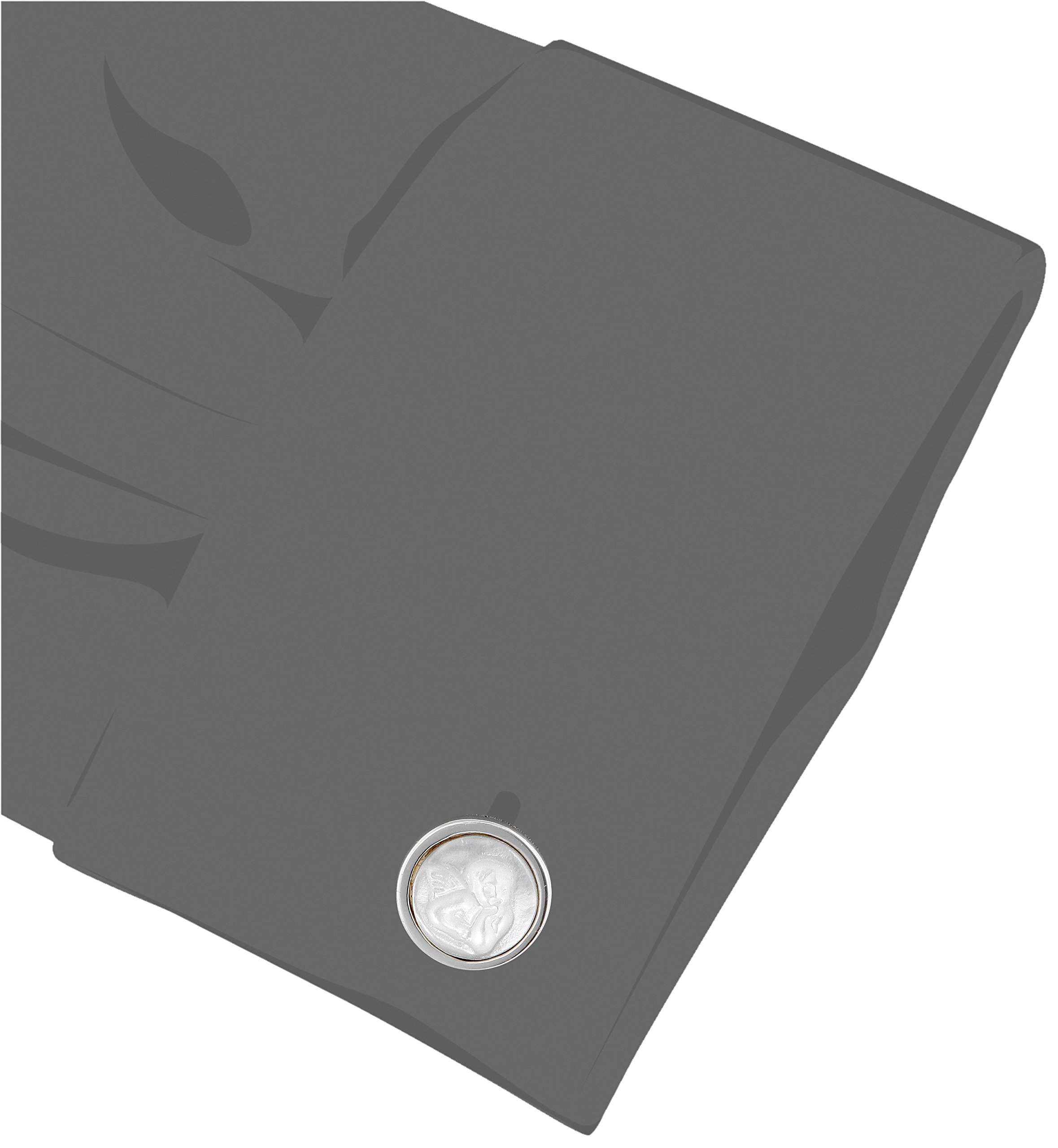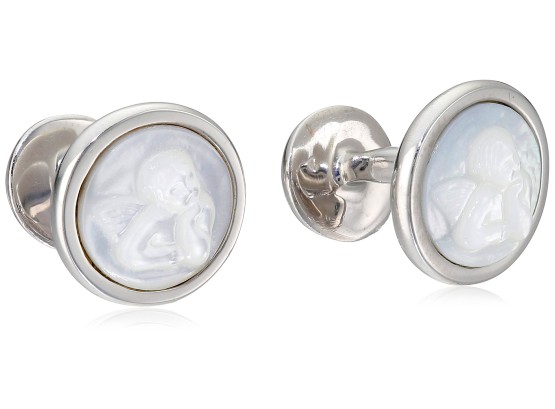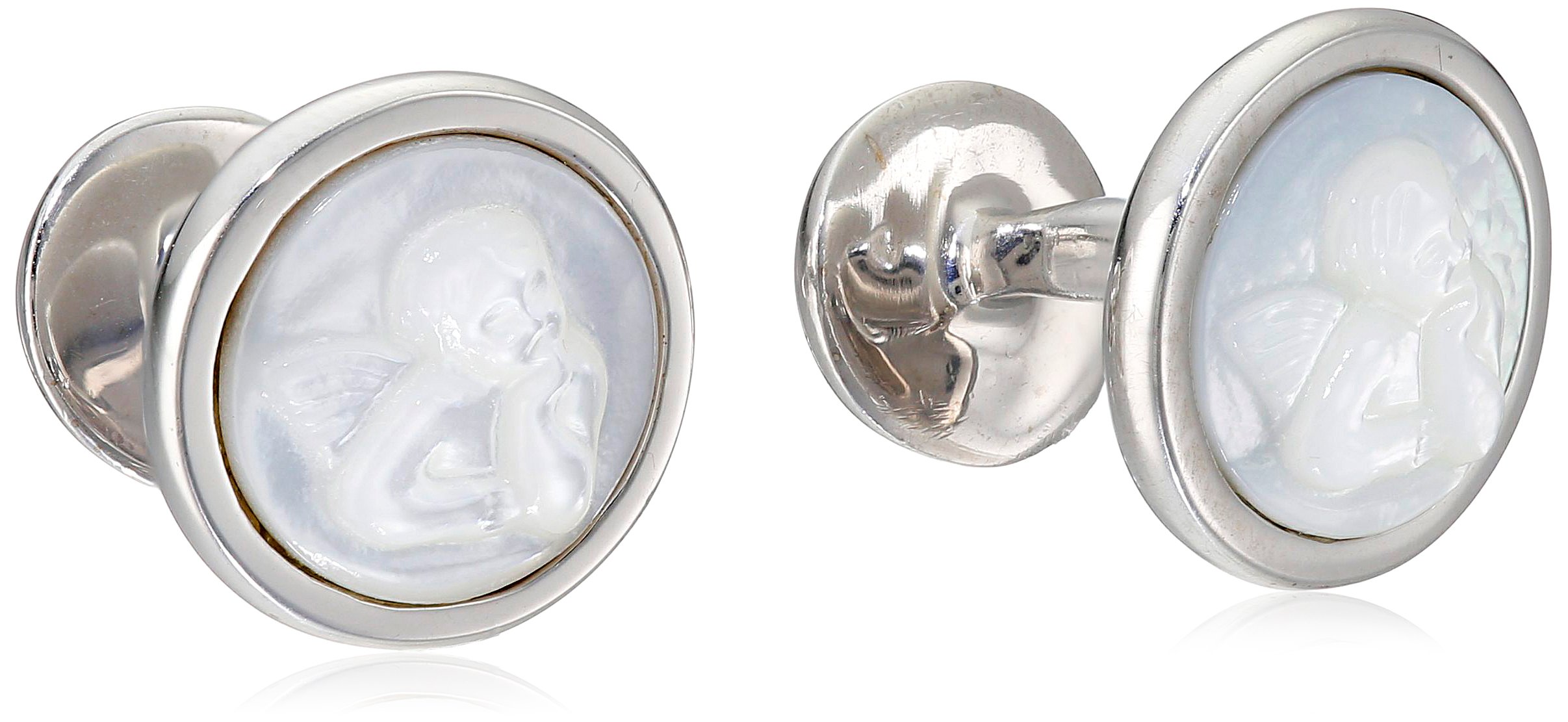 Rhodium-plated sterling silver cufflinks featuring round mother-of-pearl centerpiece with intricate carved angel Due to the natural elements of mother-of-pearl, the stone may vary in color, size or shape. Made in United States