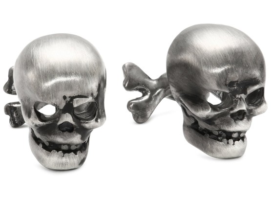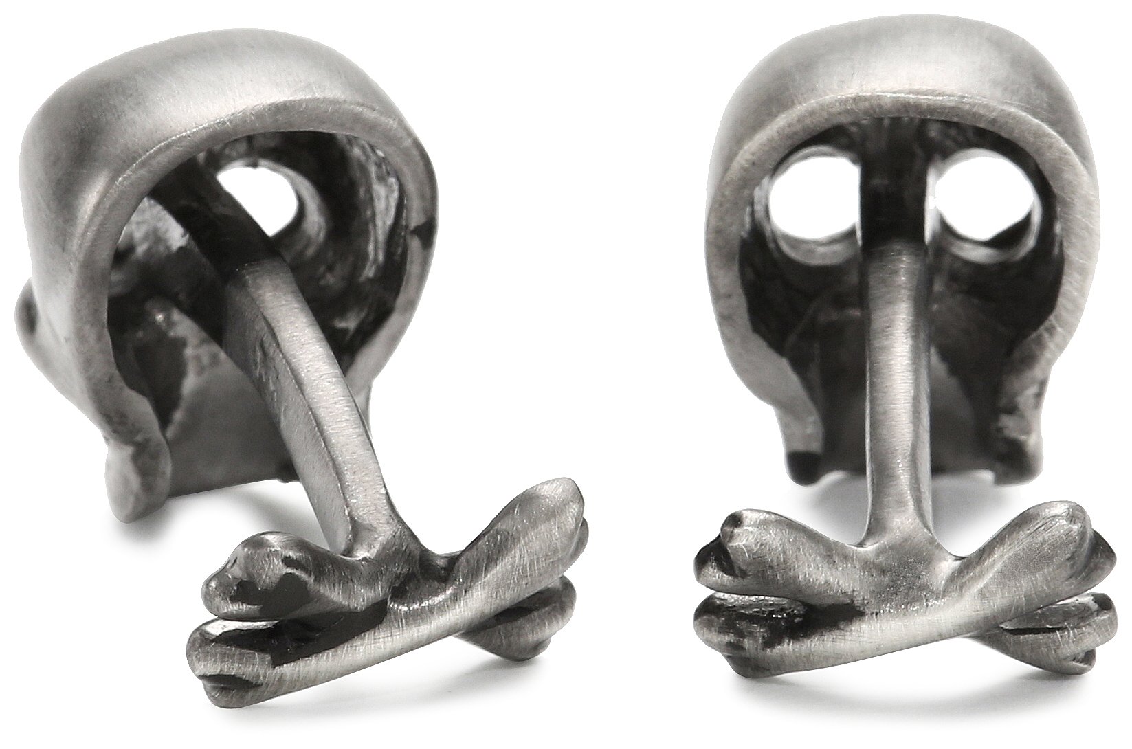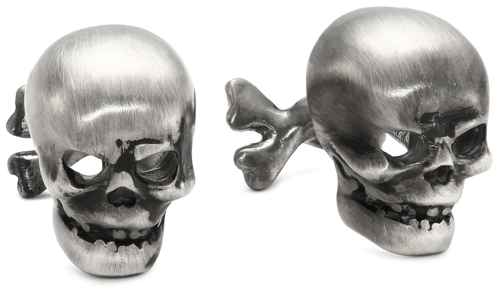 Brushed sterling silver cuff links featuring skull fronts and crossbones backings Domestic
