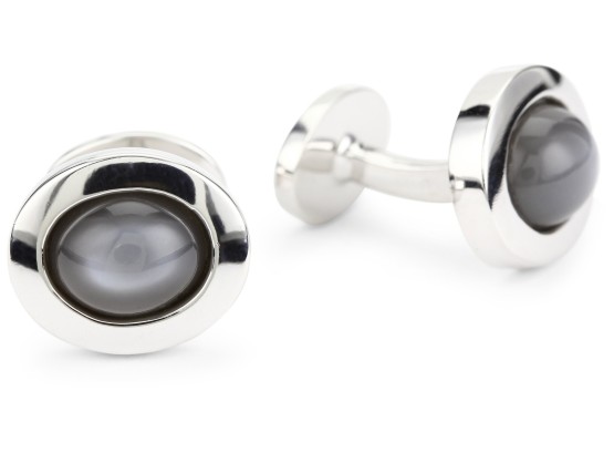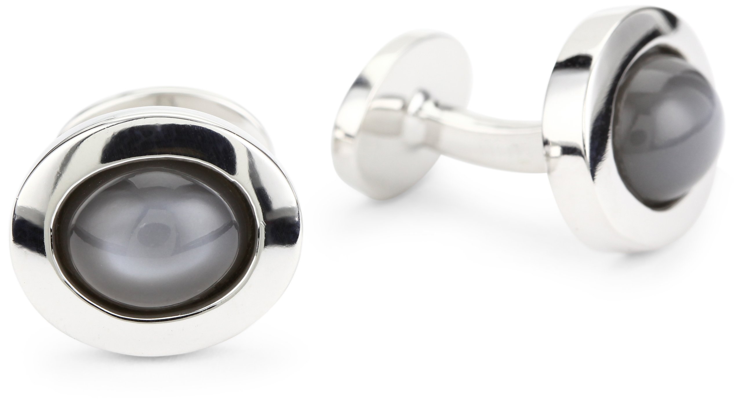 Sterling silver cufflinks featuring oval moonstone cabochons in polished bezel settings Due to the natural elements of moonstone, the stone may vary in color, size or shape. Made in United States