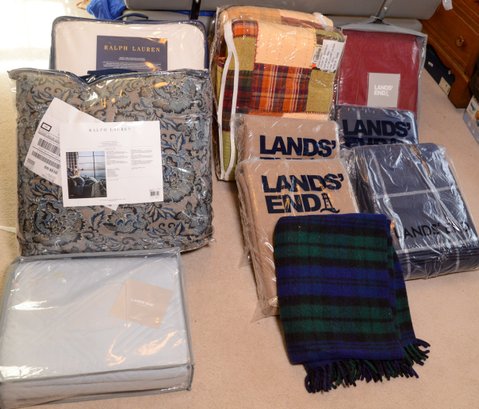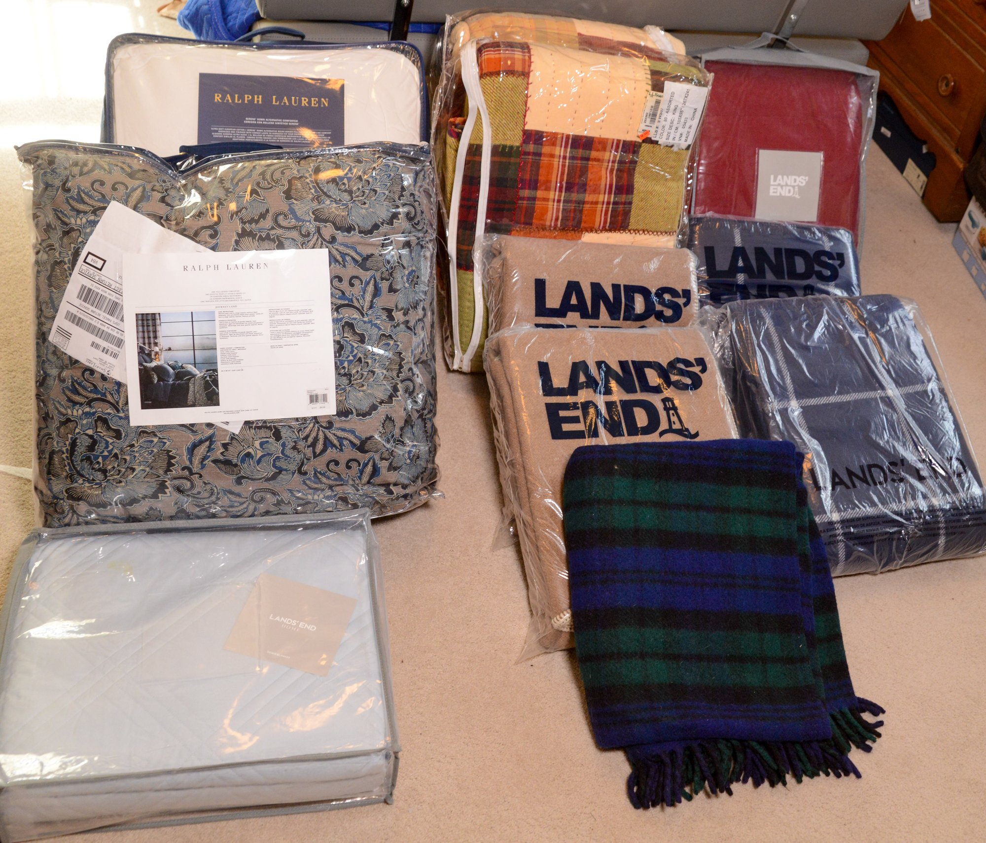 Ralph Lauren Twin comforter, RL Queen comforter, 2 Lands End down blankets, 4 Lands End wool blanklets, 2 LLBan patchwork quilts King, 1 wool Spean Bridge Scottland wool blanket.
