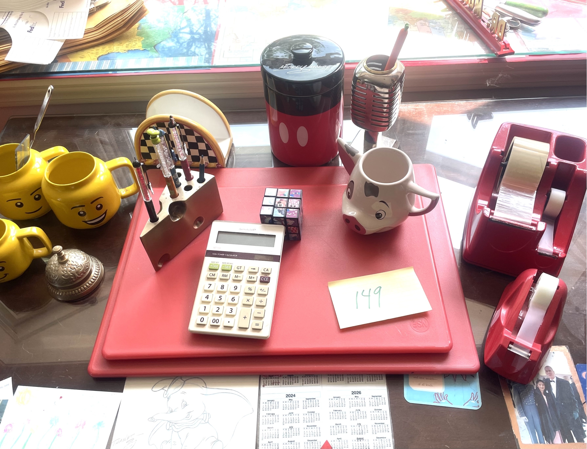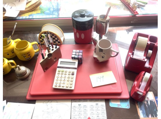 Including Disney pencil holders, Mickey Mouse canister, cups Disney Rubix Cube, tape dispensers, 2 red cutting boards etc. Height of canister 7 inches.