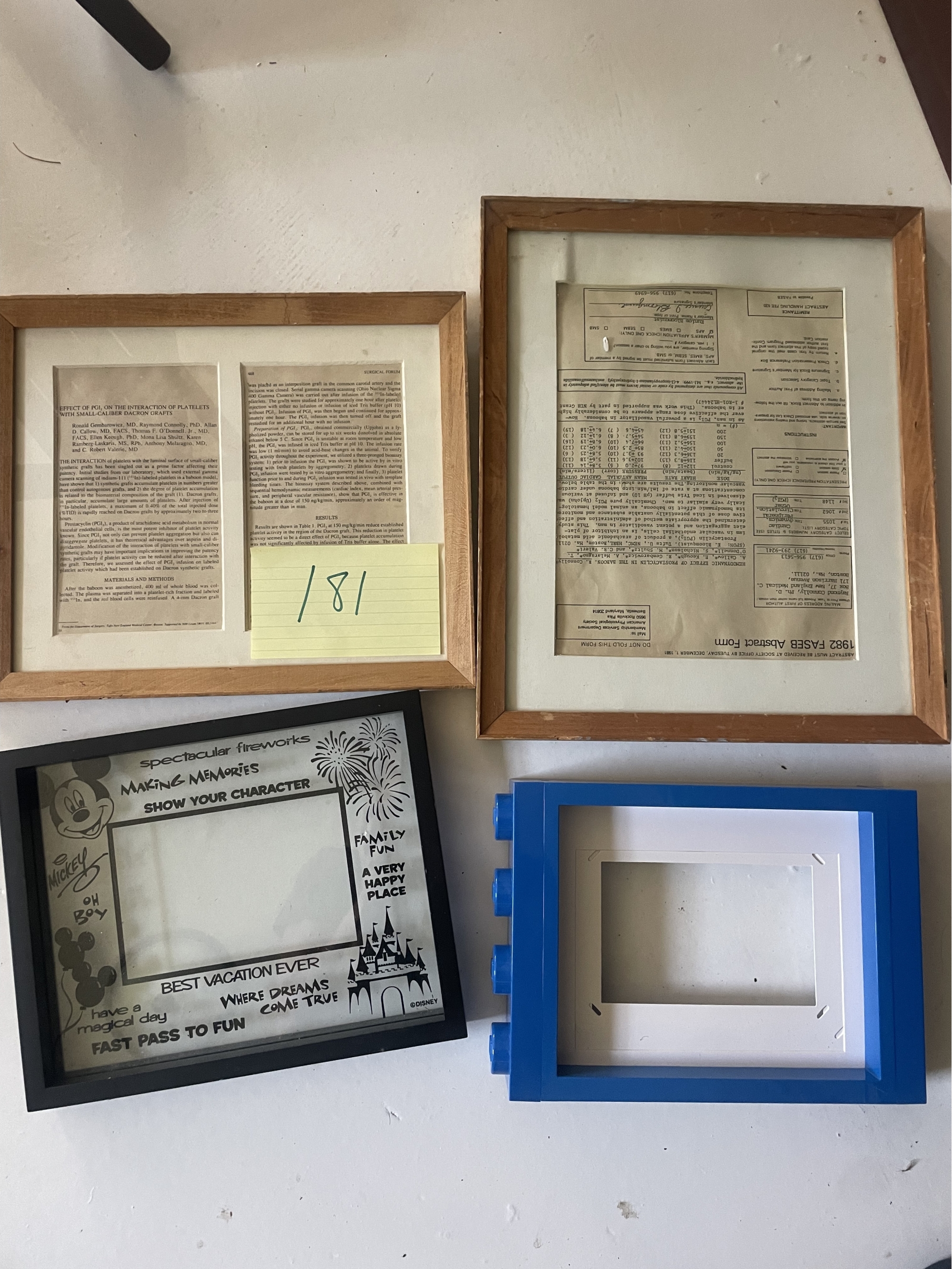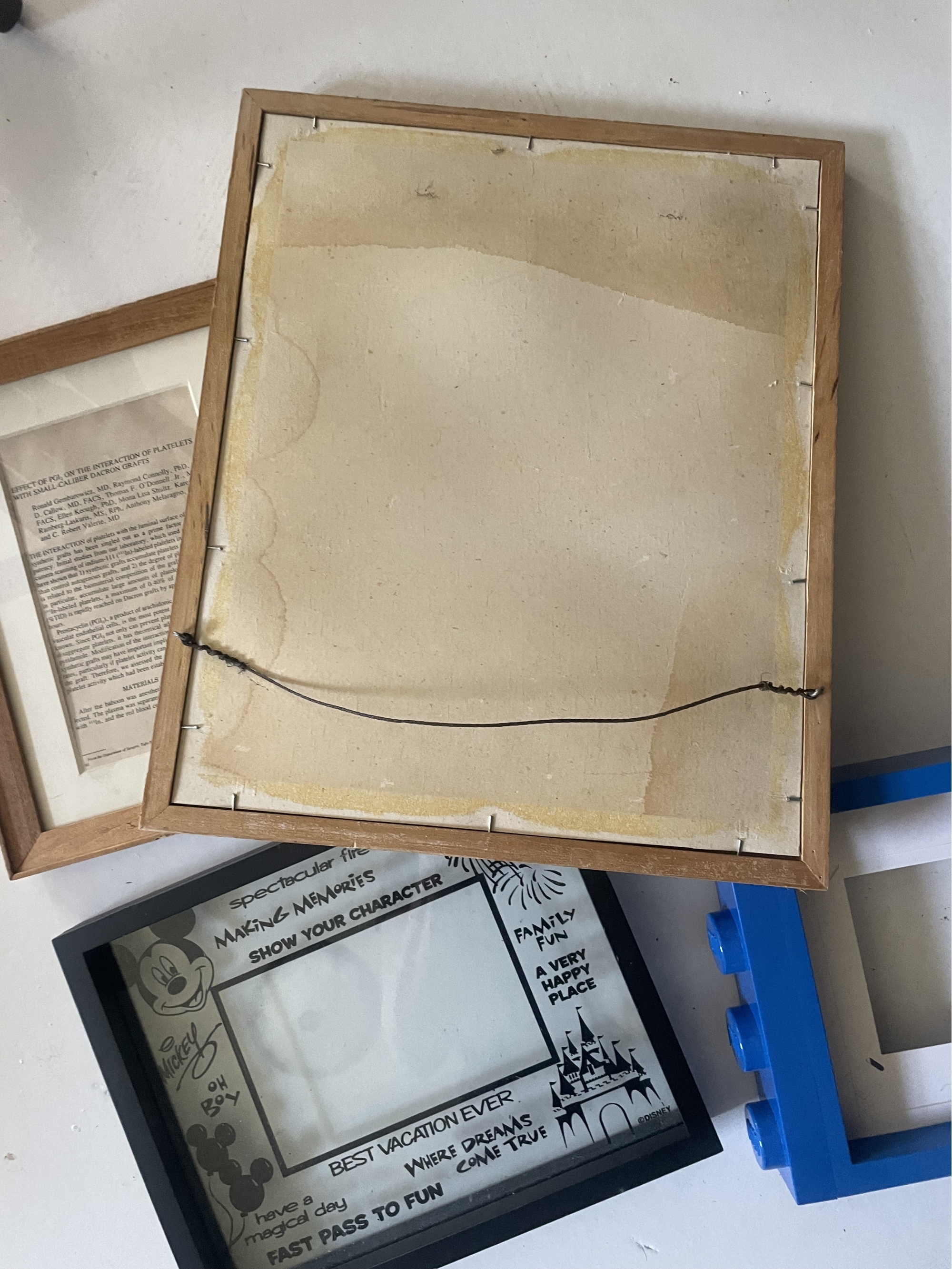 Including 2 wood frames, a lego frame and Mickey Mouse Frame. Larger wood frame 15 inches x 12.5 inches.