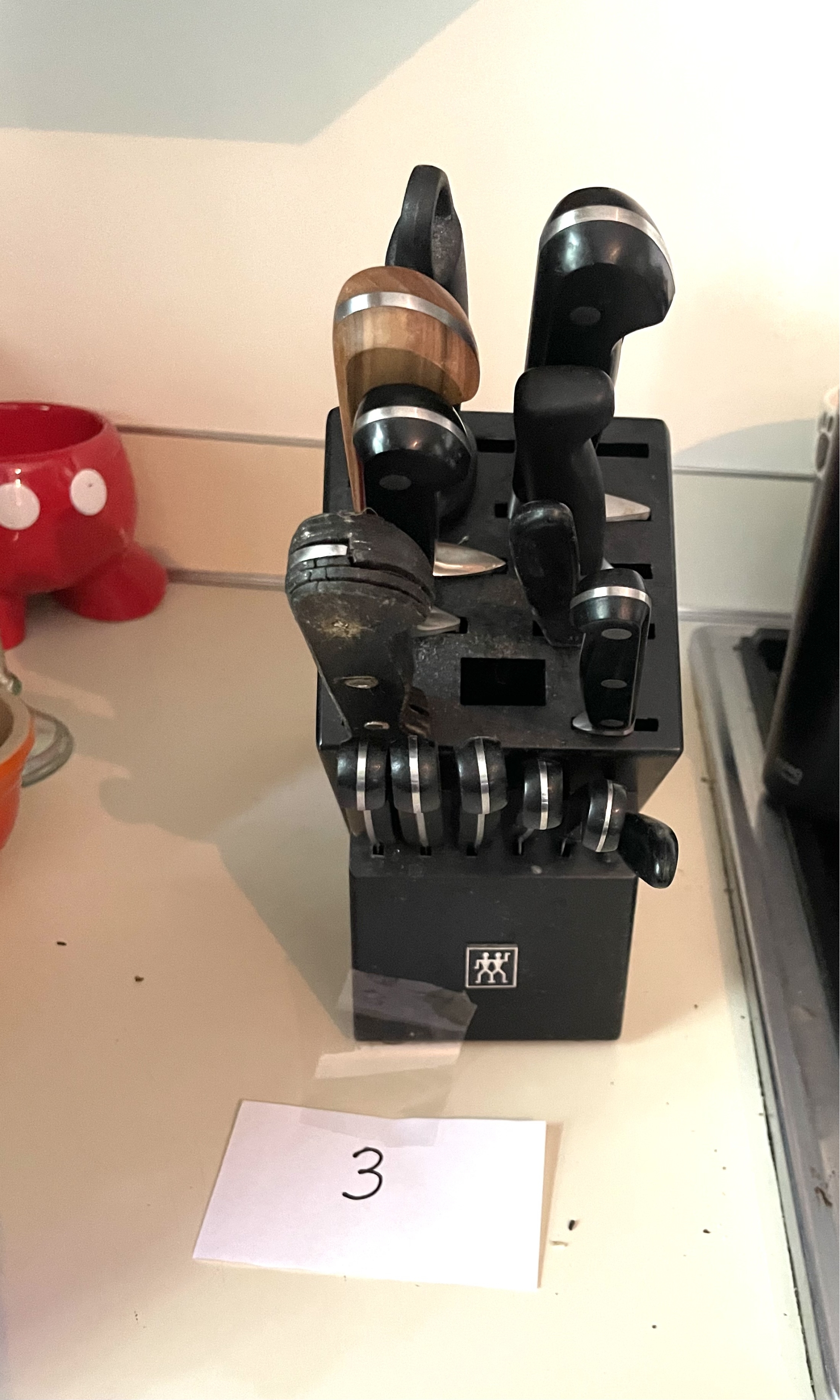 Including Zwilling Professional knives, 5 steak knives and Henckels knife and sharpener. Longest knife 13.5 inches.