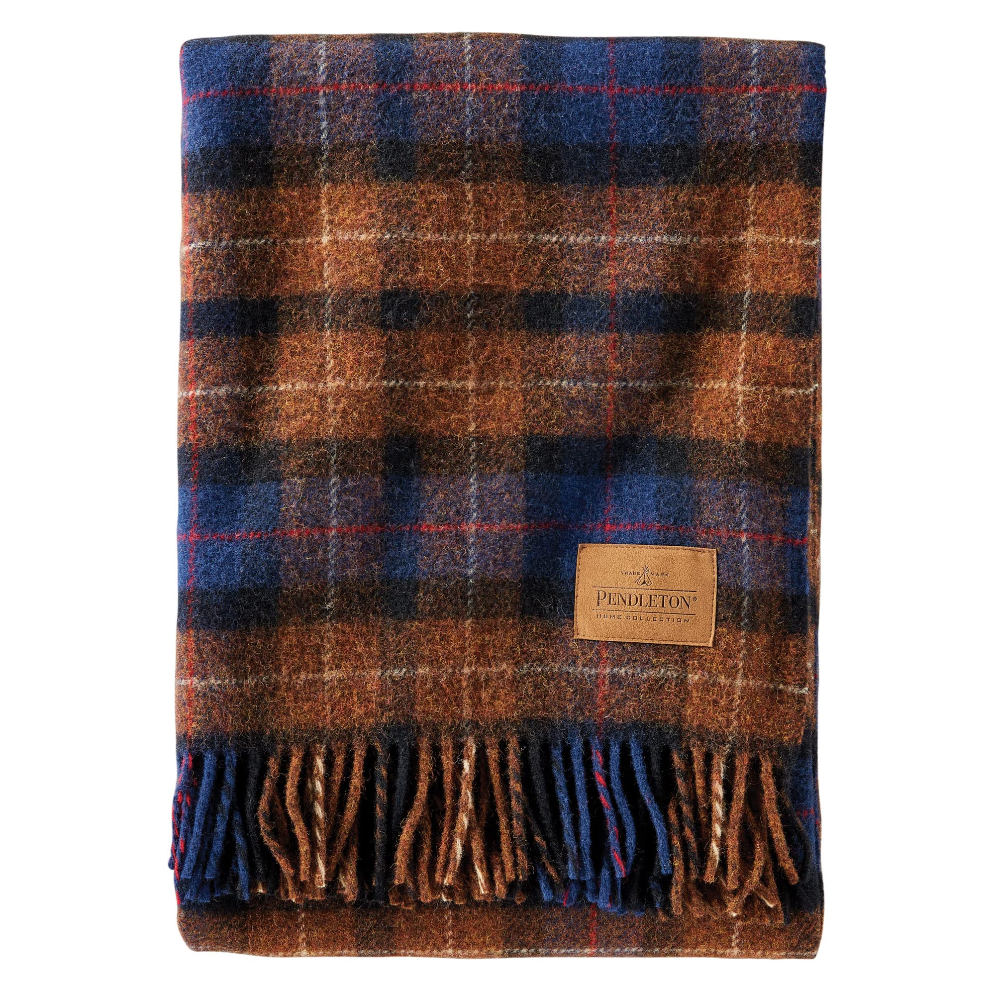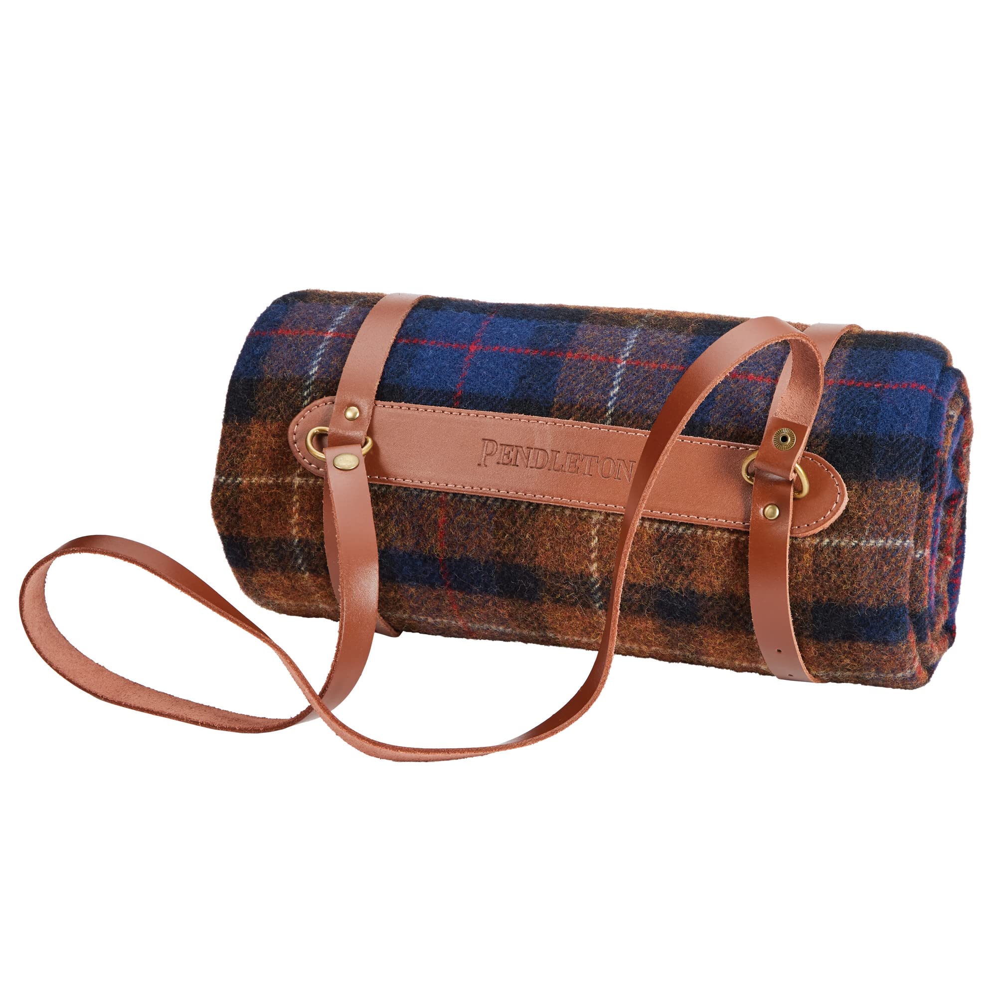 52" x 66" plus 3" rolled self fringe Sturdy, lofty weave is ideal for keeping warm in the sports stadium, picnics in the forest, or car trips Genuine Pendleton plaids and authentic tartans 100% virgin wool Pendleton faux leather patch