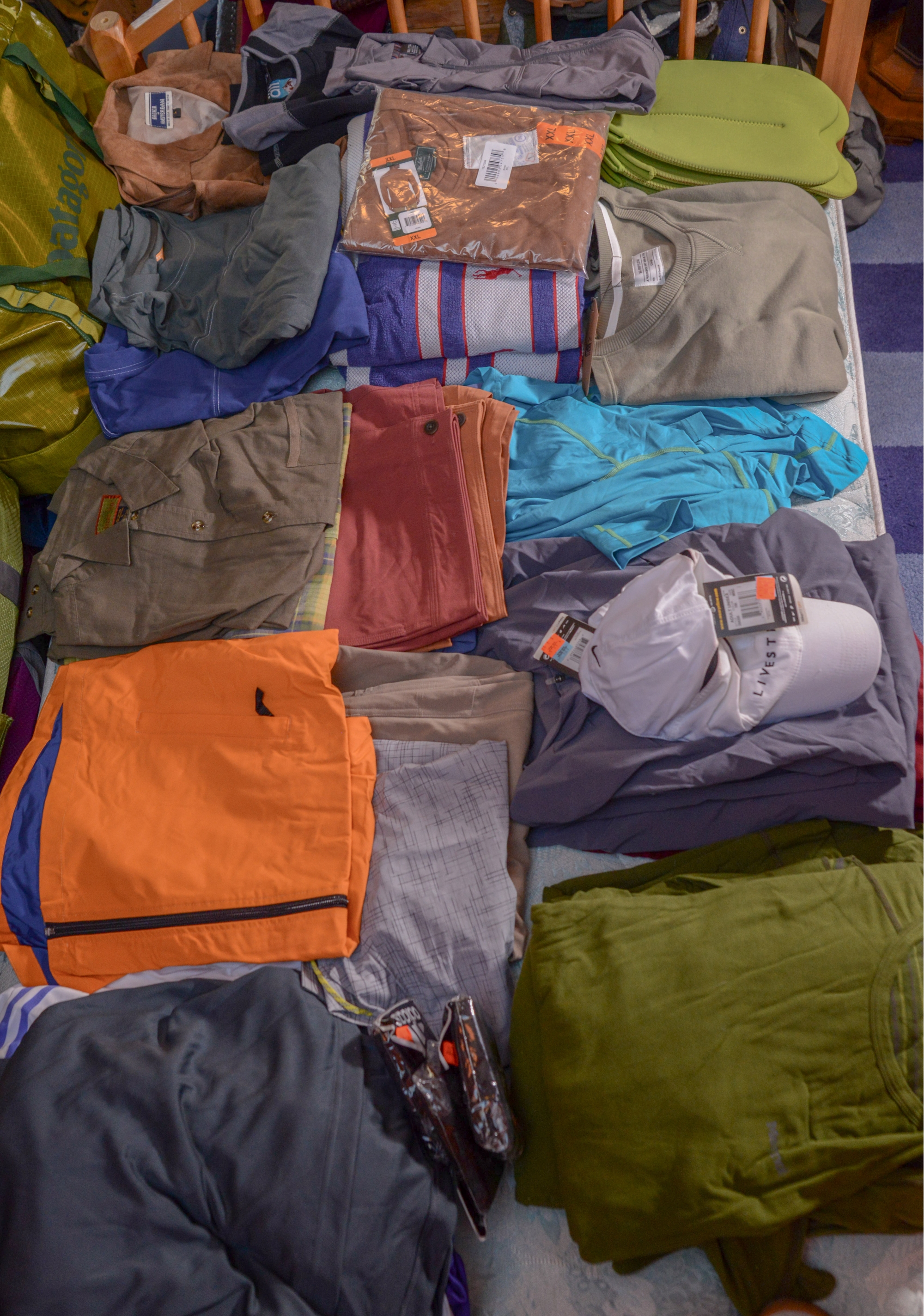 Horny Toad, Adidas, Nike, Cosmocom, REI, Polo, Royal Robin, Merril, Alf and others. Primarily shirts, most NWT.