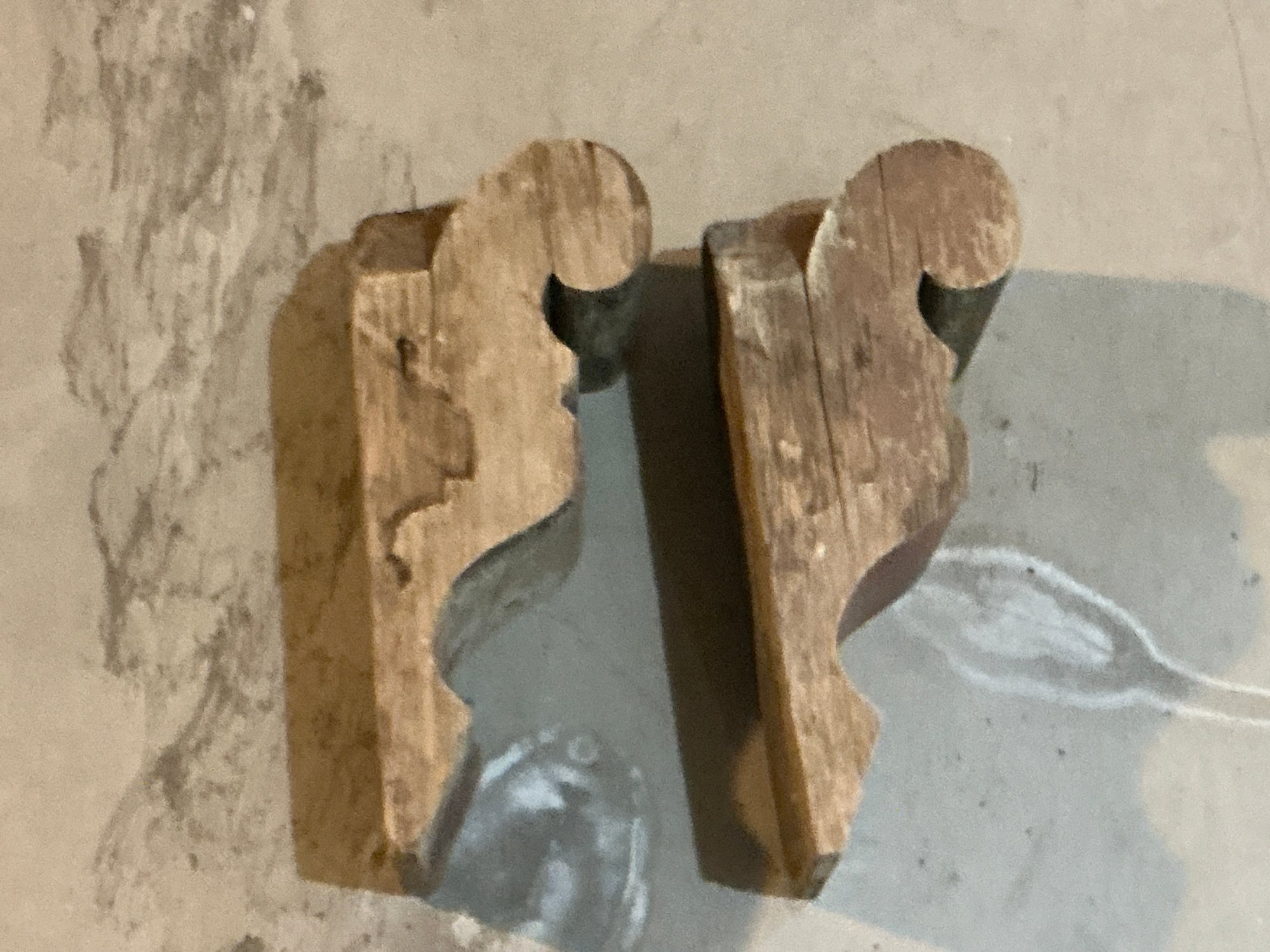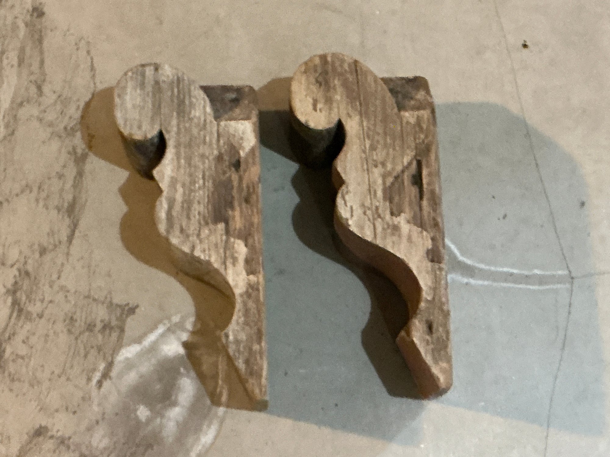 Pair of antique wooden corbels in good condition. Measure 13” H x 6” D.